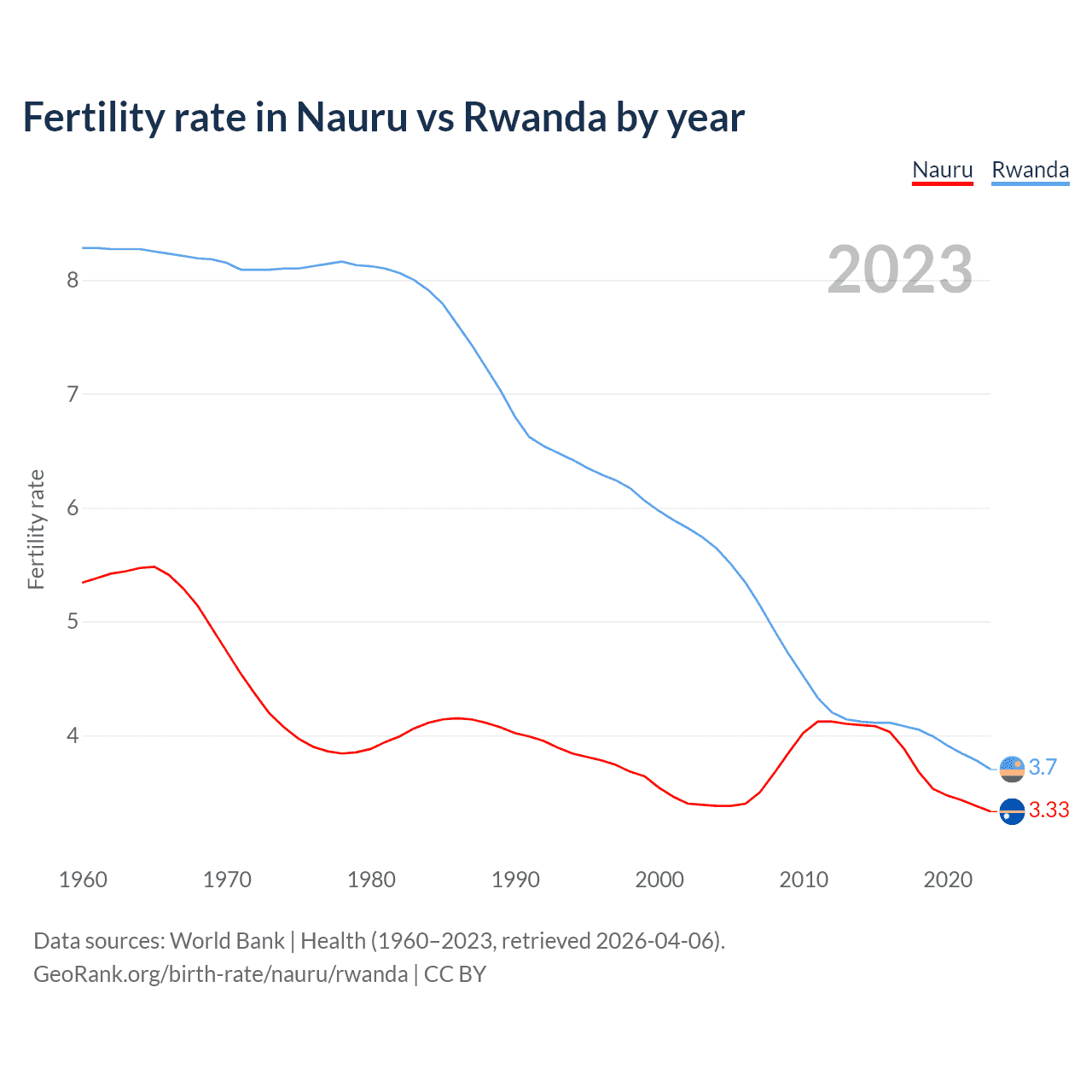 Fertility rate in Nauru vs Rwanda by year
