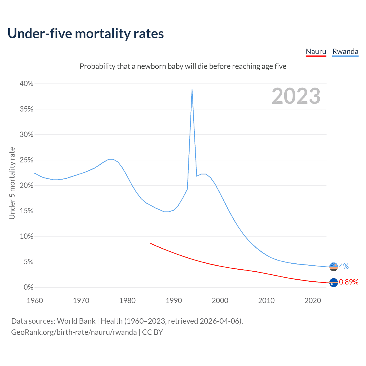 The chance that a newborn baby will die before reaching age five is 0.89% in Nauru and 4% in Rwanda. Above is a chart with historical data on under-five mortality rates.