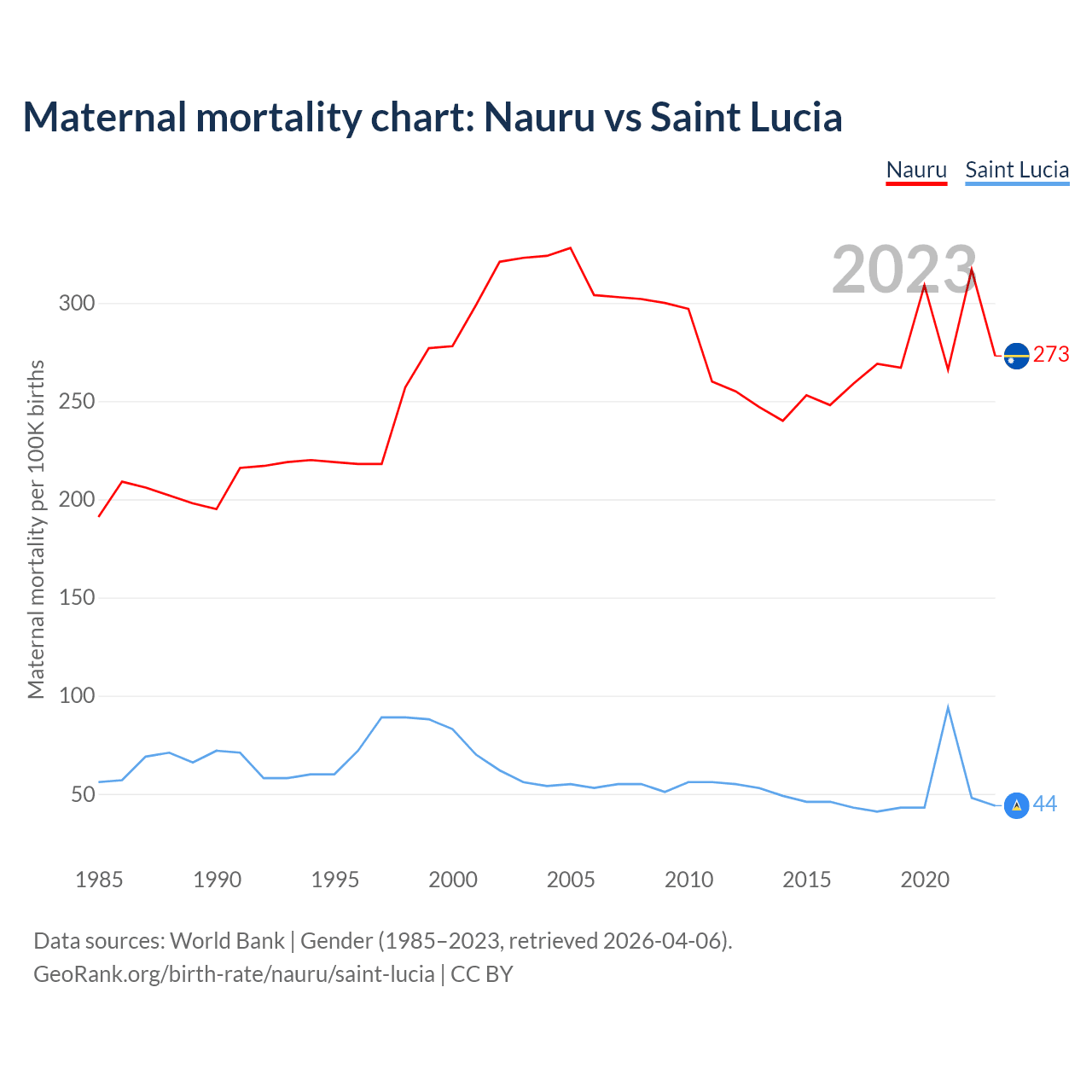 The maternal mortality rate, which is the probability of dying during childbirth or within 42 days of pregnancy termination, is 273 deaths per 100,000 live births in Nauru, compared to 44 deaths in Saint Lucia.