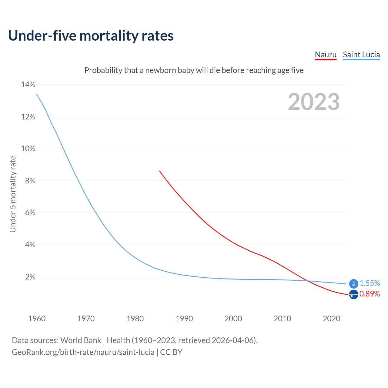 The chance that a newborn baby will die before reaching age five is 0.89% in Nauru and 1.55% in Saint Lucia. Above is a chart with historical data on under-five mortality rates.