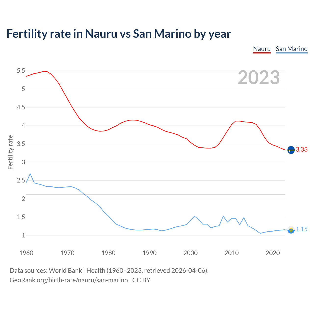 According to the latest available data on birth rates, the fertility rate in Nauru was 3.33 children per woman in 2023, compared to 1.15 in San Marino in 2023. The replacement level is considered to be 2.1 children per woman.