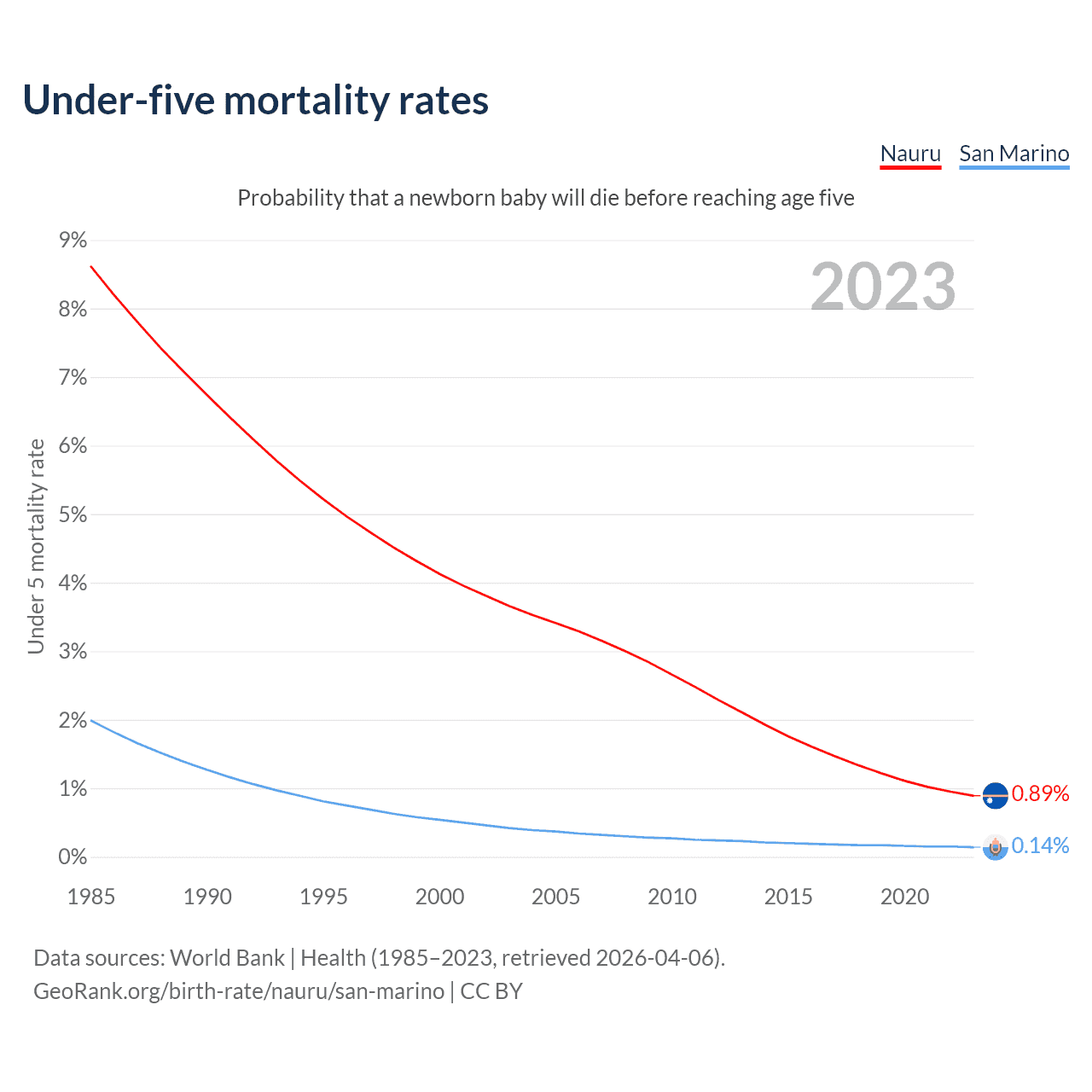 The chance that a newborn baby will die before reaching age five is 0.89% in Nauru and 0.14% in San Marino. Above is a chart with historical data on under-five mortality rates.