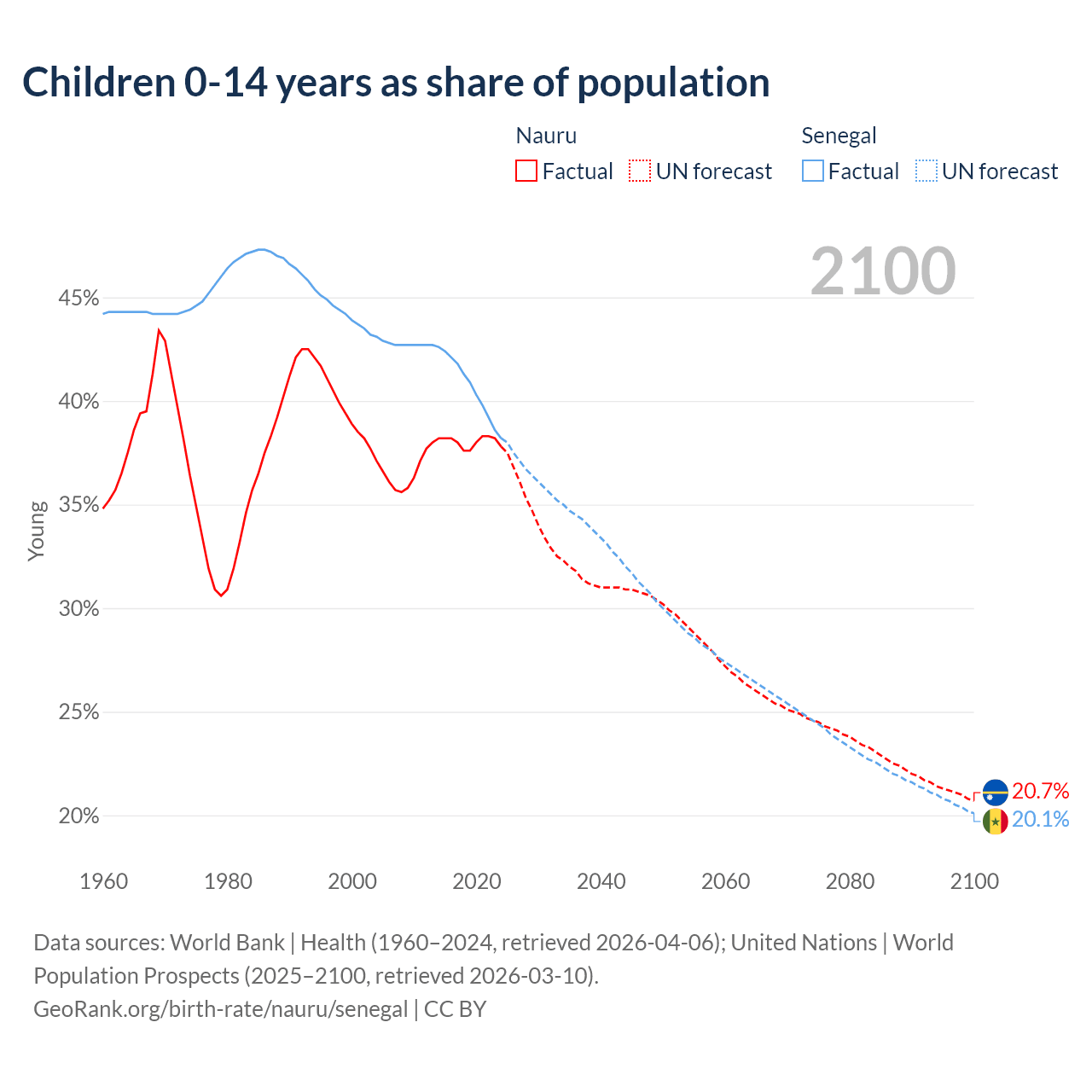 According to the latest available data on birth rates, the fertility rate in Nauru was 3.33 children per woman in 2023, compared to 3.82 in Senegal in 2023. The replacement level is considered to be 2.1 children per woman.
