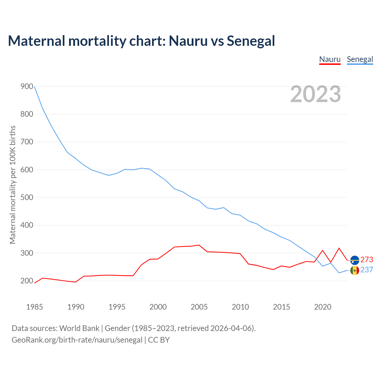 The maternal mortality rate, which is the probability of dying during childbirth or within 42 days of pregnancy termination, is 273 deaths per 100,000 live births in Nauru, compared to 237 deaths in Senegal.
