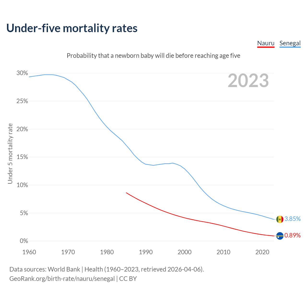 The chance that a newborn baby will die before reaching age five is 0.89% in Nauru and 3.85% in Senegal. Above is a chart with historical data on under-five mortality rates.