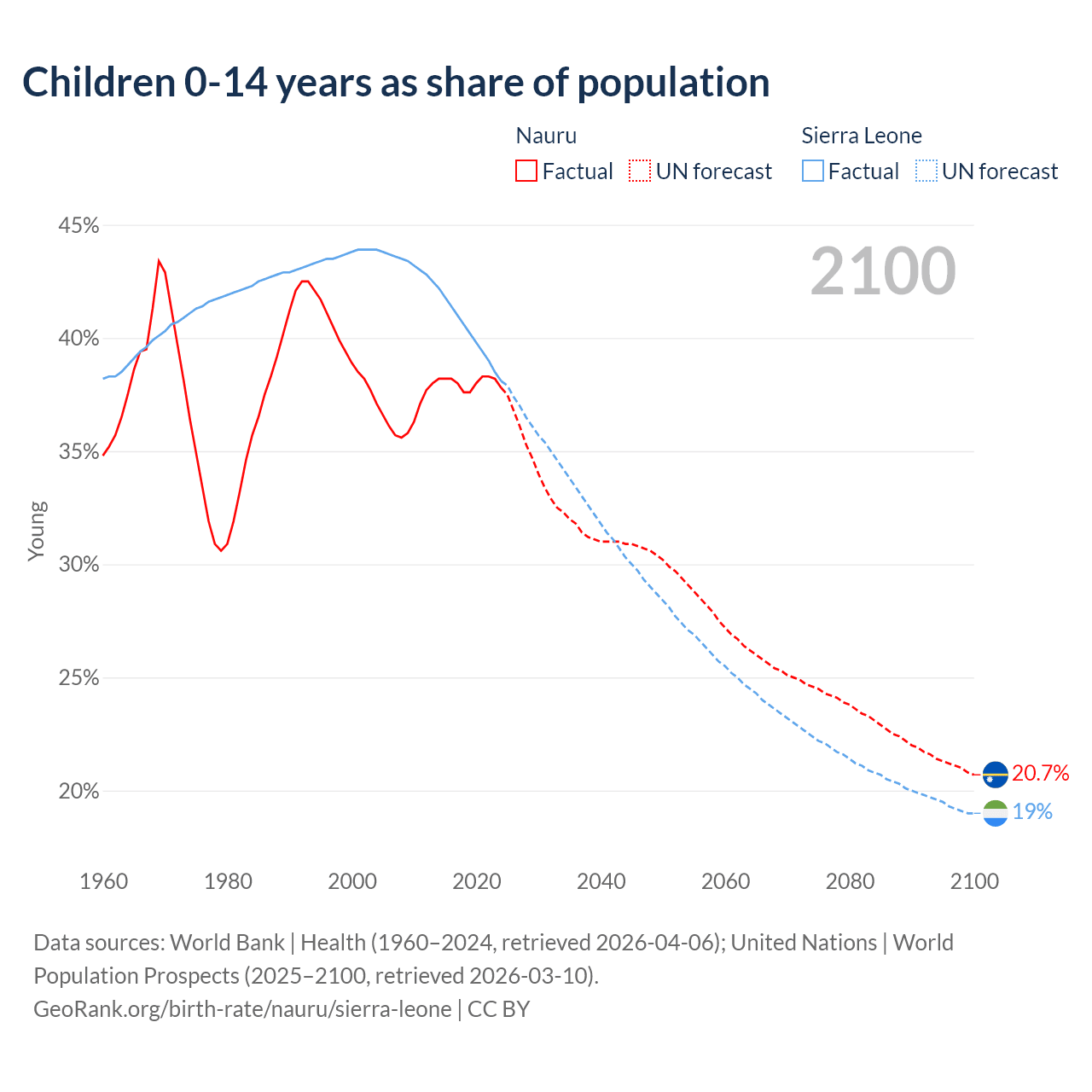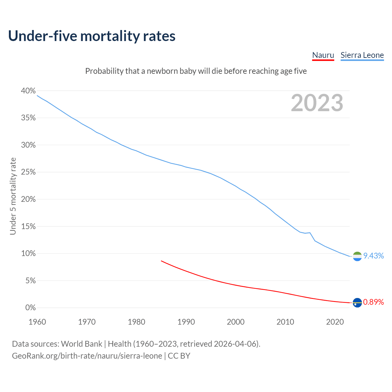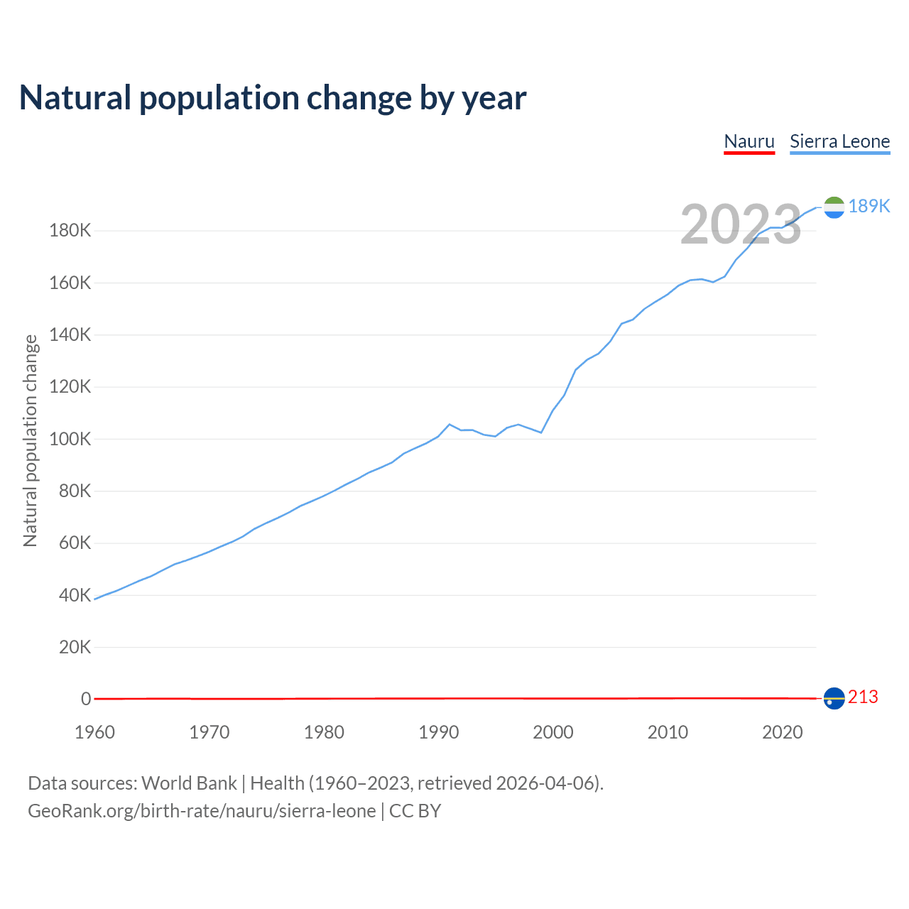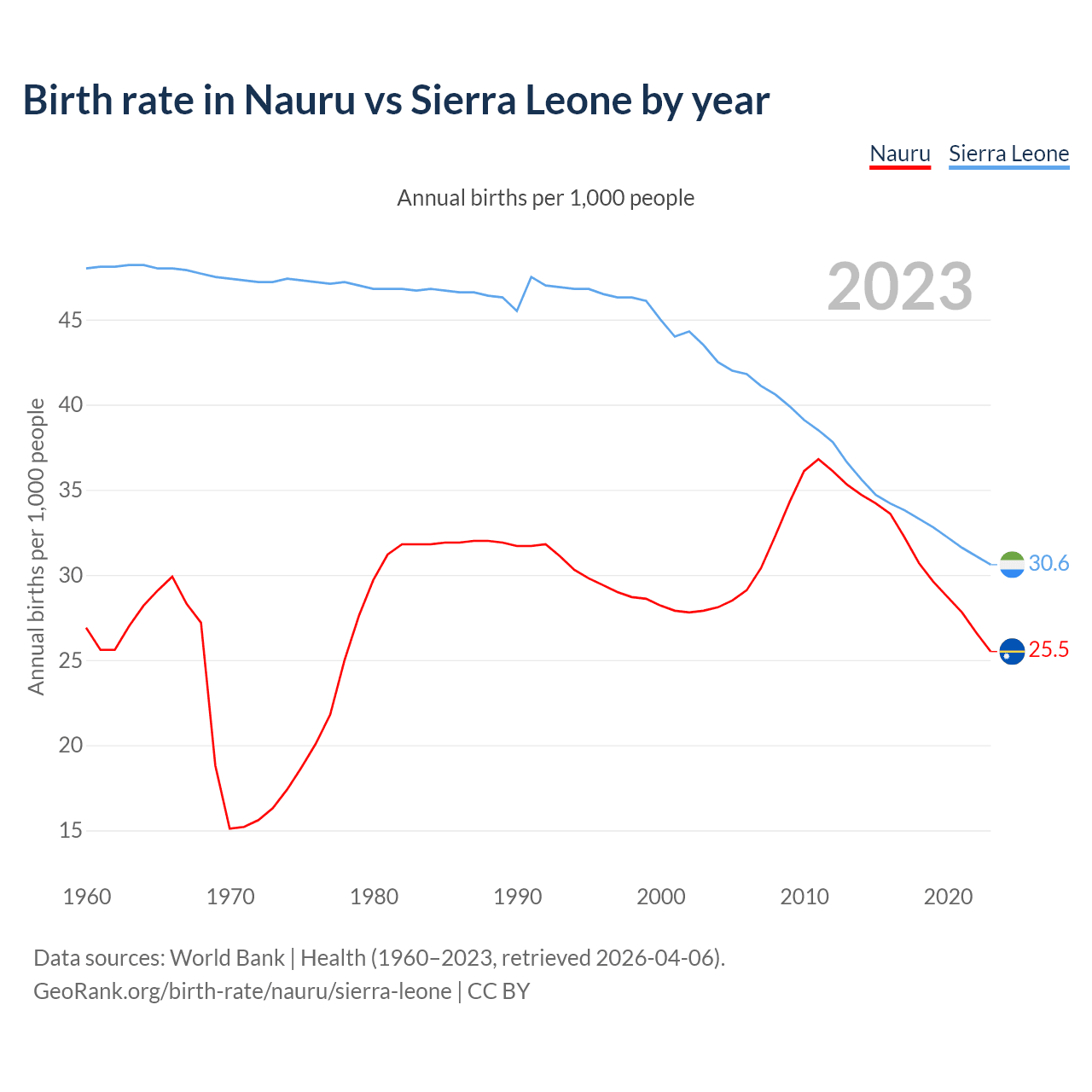 Nauru has an annual birth rate of 25.5 births per 1,000 people, compared to 30.6 for Sierra Leone. The average number of children a woman is expected to have during her lifetime — the fertility rate, is 3.33 in Nauru and 3.79 in Sierra Leone — 13.8% difference.