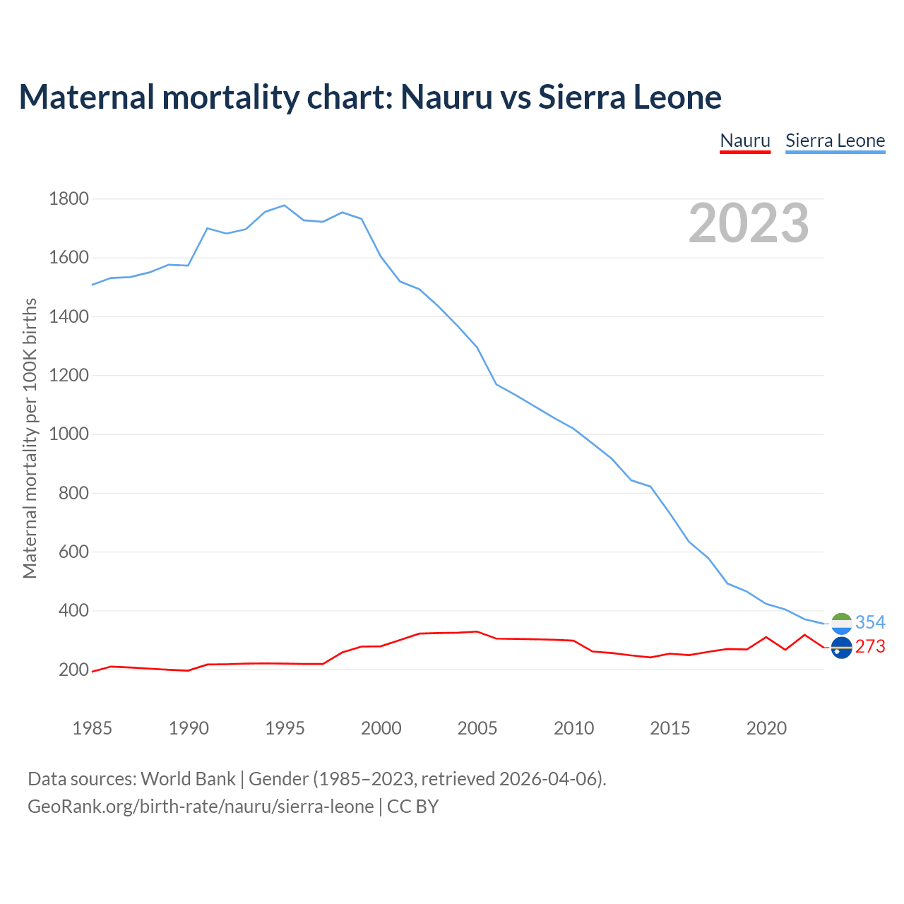The maternal mortality rate, which is the probability of dying during childbirth or within 42 days of pregnancy termination, is 273 deaths per 100,000 live births in Nauru, compared to 354 deaths in Sierra Leone.