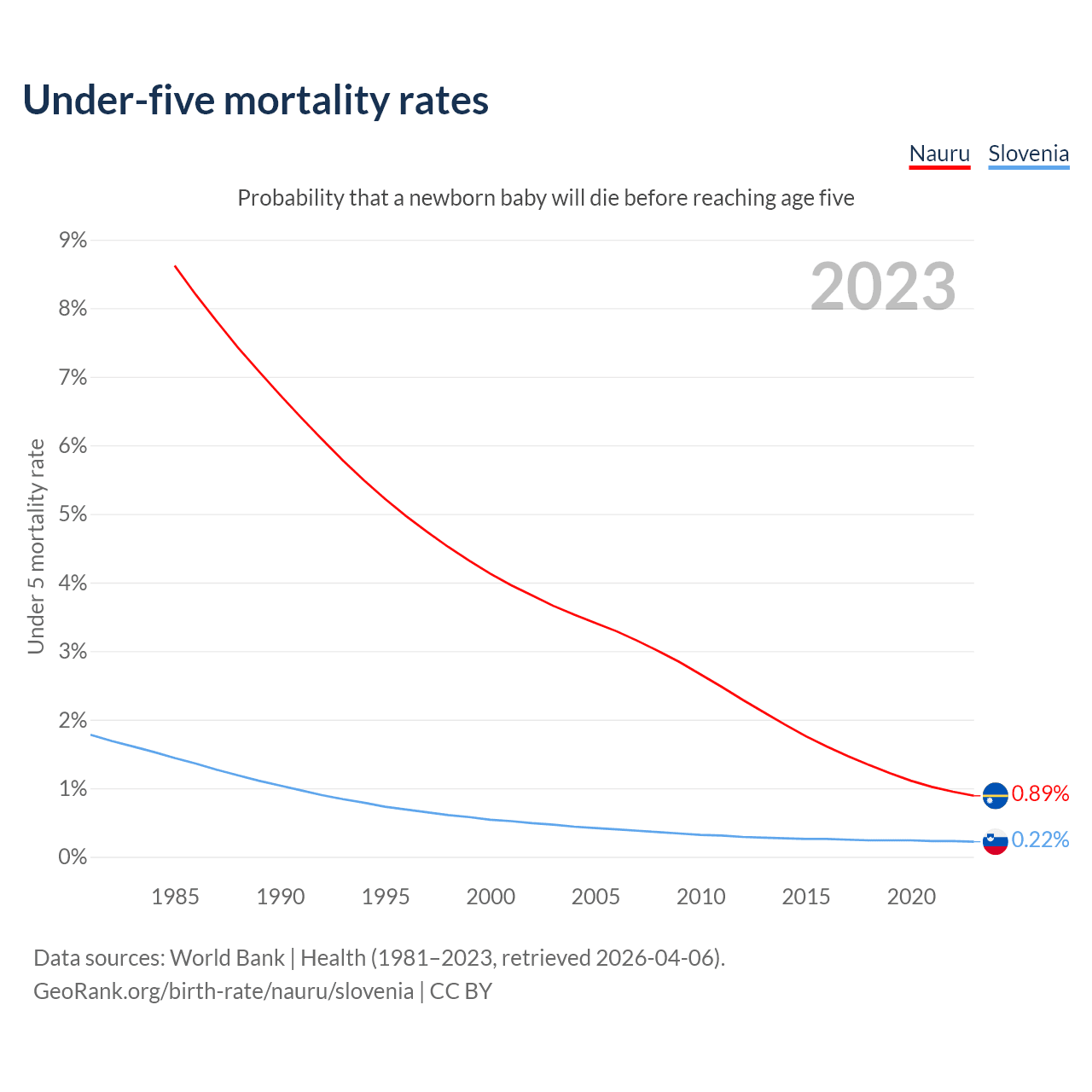 The chance that a newborn baby will die before reaching age five is 0.89% in Nauru and 0.22% in Slovenia. Above is a chart with historical data on under-five mortality rates.