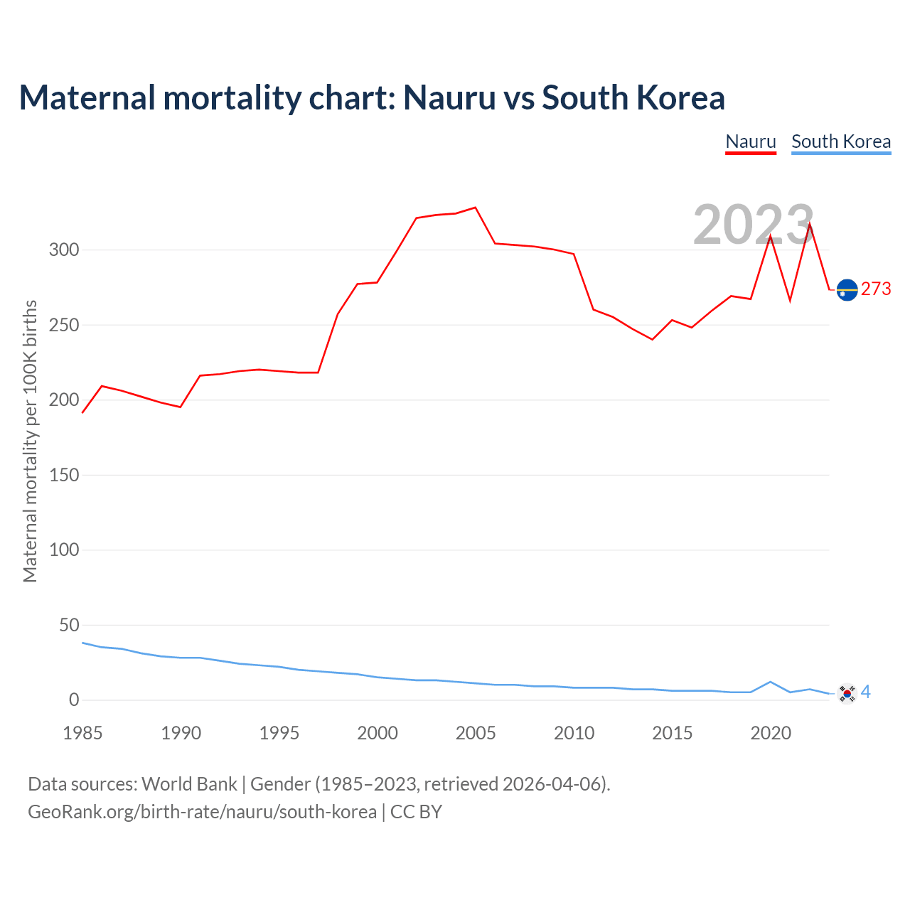 The maternal mortality rate, which is the probability of dying during childbirth or within 42 days of pregnancy termination, is 273 deaths per 100,000 live births in Nauru, compared to 4 deaths in South Korea.
