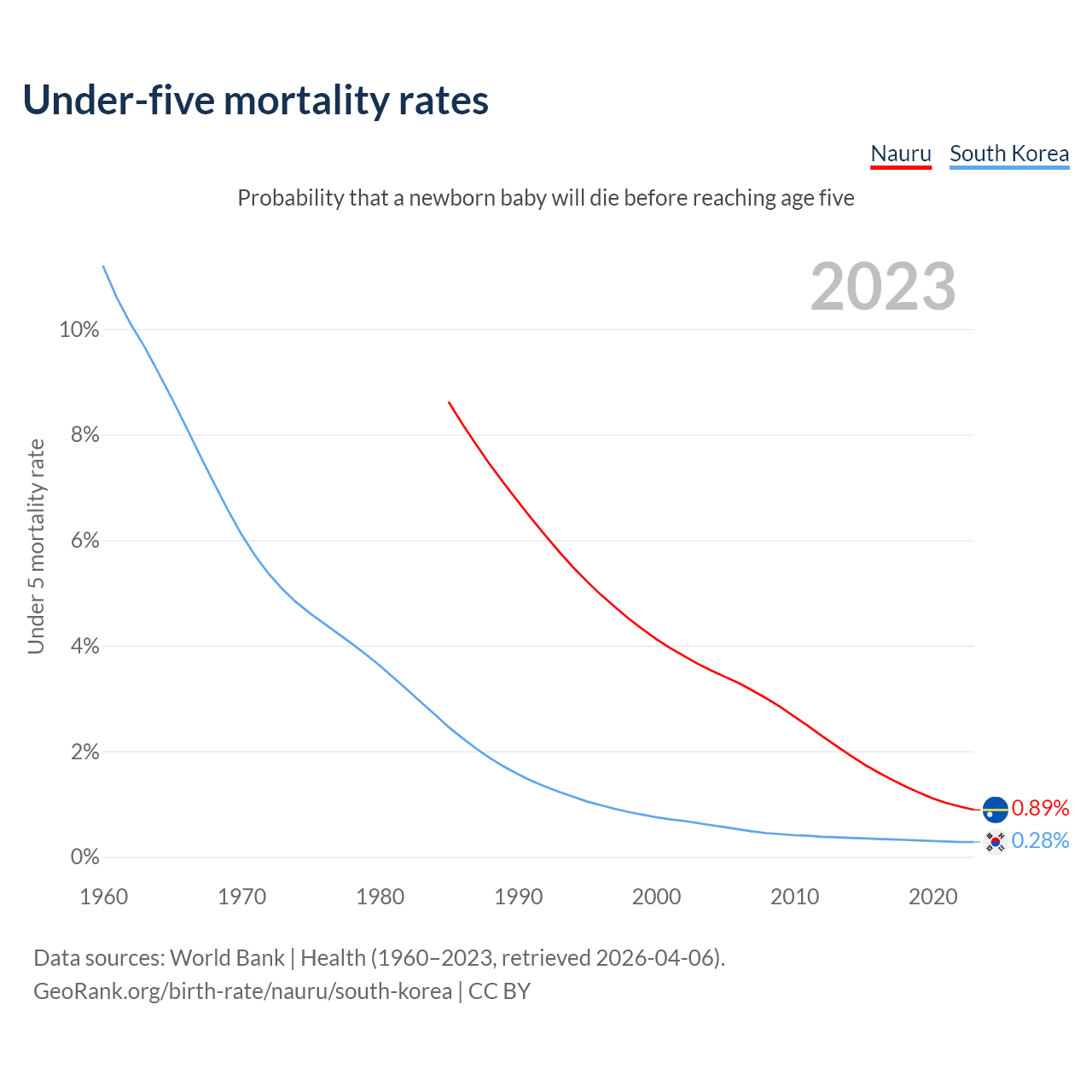 The chance that a newborn baby will die before reaching age five is 0.89% in Nauru and 0.28% in South Korea. Above is a chart with historical data on under-five mortality rates.