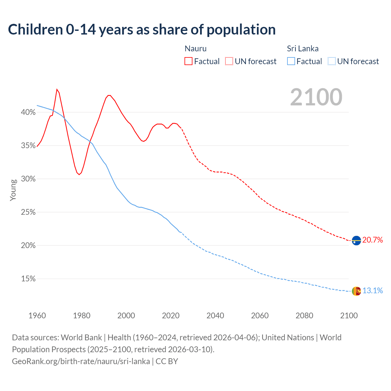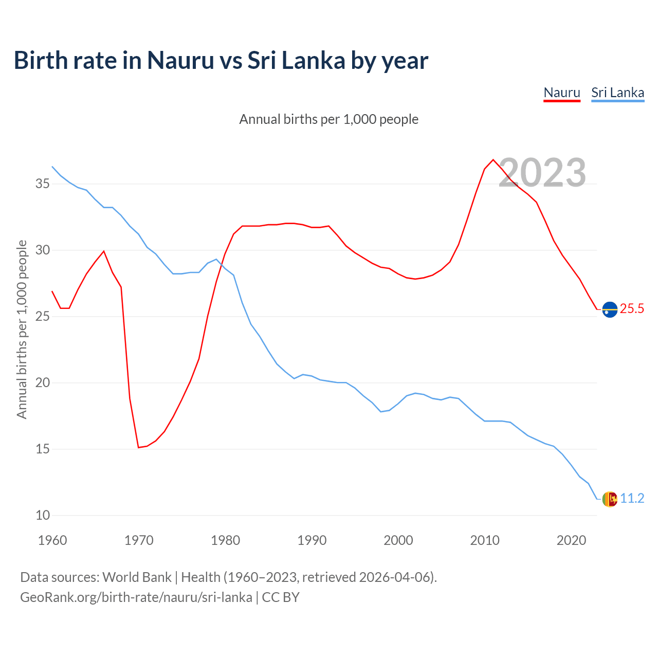 Nauru has an annual birth rate of 25.5 births per 1,000 people, compared to 11.2 for Sri Lanka. The average number of children a woman is expected to have during her lifetime — the fertility rate, is 3.33 in Nauru and 1.97 in Sri Lanka — 40.7% difference.