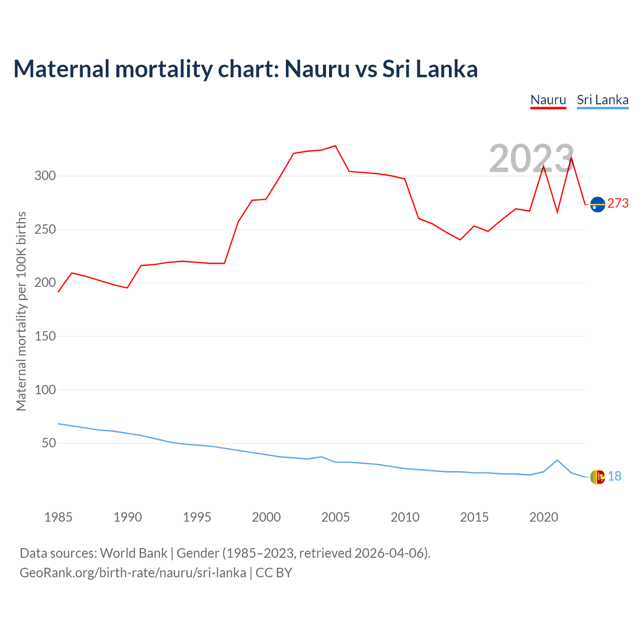 The maternal mortality rate, which is the probability of dying during childbirth or within 42 days of pregnancy termination, is 273 deaths per 100,000 live births in Nauru, compared to 18 deaths in Sri Lanka.