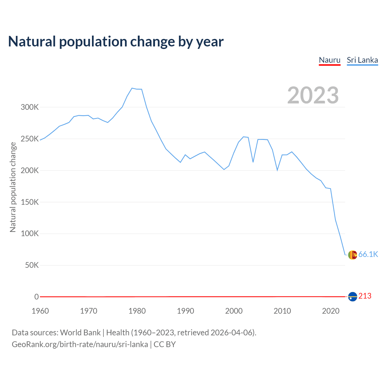 According to the latest available data on birth rates, the fertility rate in Nauru was 3.33 children per woman in 2023, compared to 1.97 in Sri Lanka in 2023. The replacement level is considered to be 2.1 children per woman.