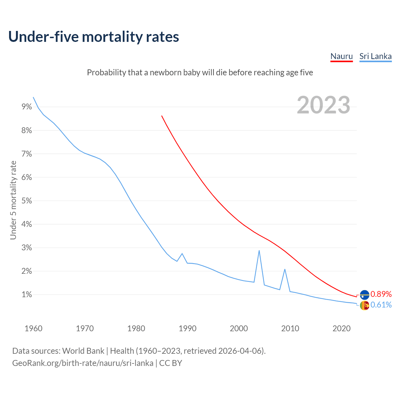 The chance that a newborn baby will die before reaching age five is 0.89% in Nauru and 0.61% in Sri Lanka. Above is a chart with historical data on under-five mortality rates.