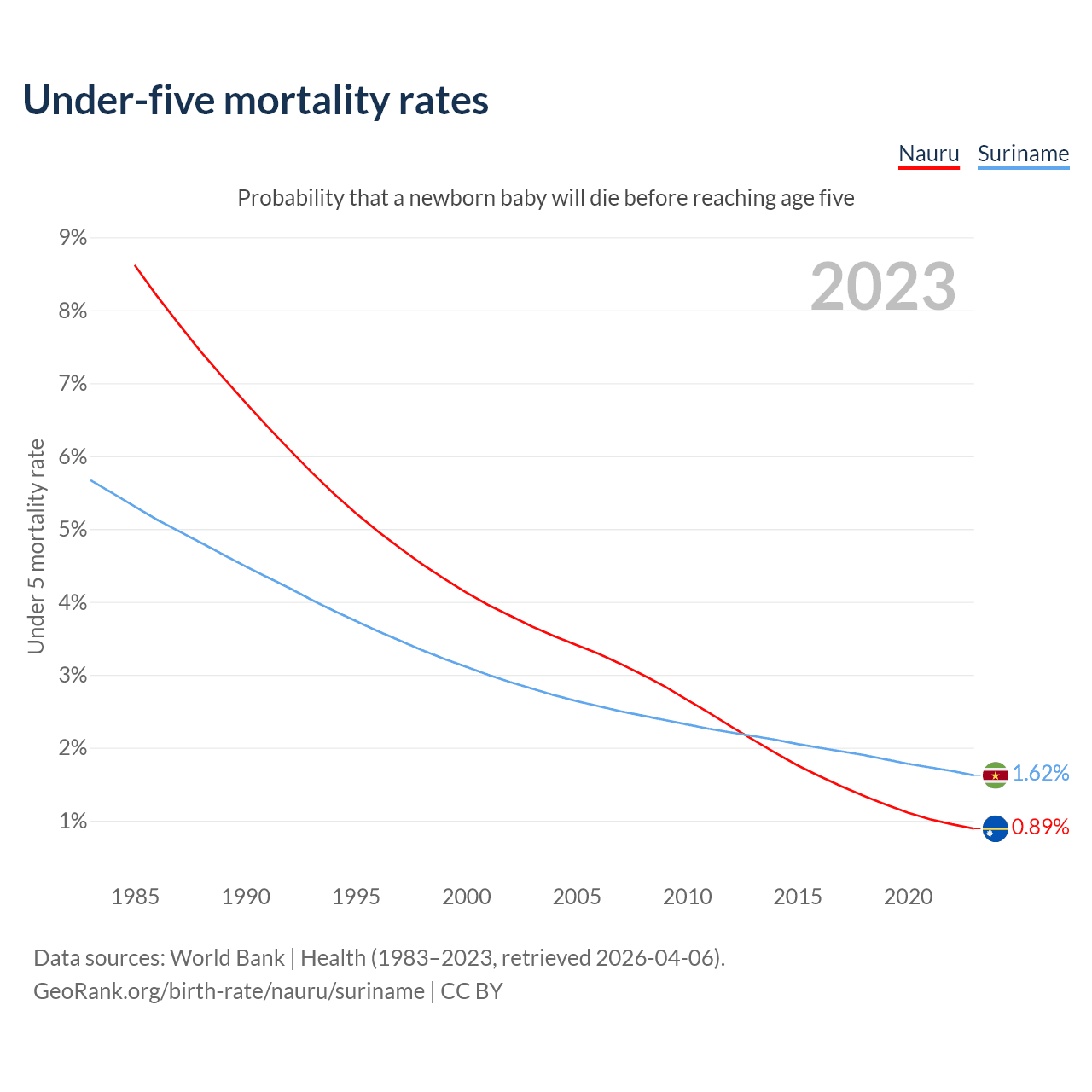 The chance that a newborn baby will die before reaching age five is 0.89% in Nauru and 1.62% in Suriname. Above is a chart with historical data on under-five mortality rates.