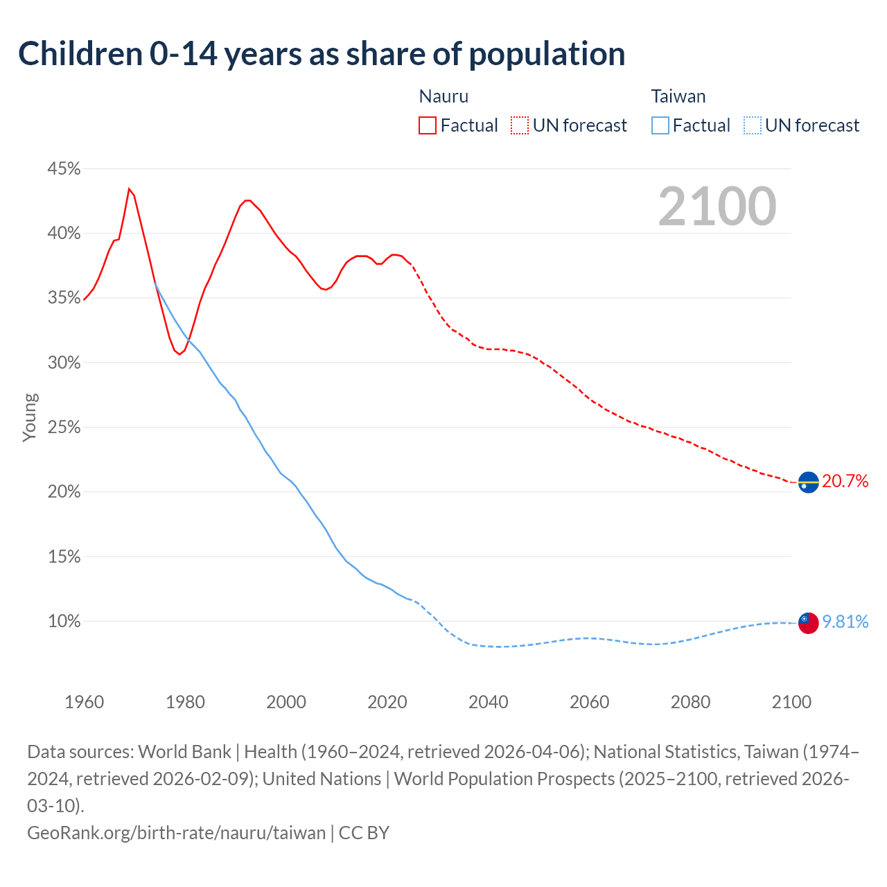 Data sources: World Bank | Health (1960–2024, retrieved 2026-04-06); National Statistics, Taiwan (1974–2024, retrieved 2026-02-09); United Nations | World Population Prospects (2025–2100, retrieved 2026-03-10).