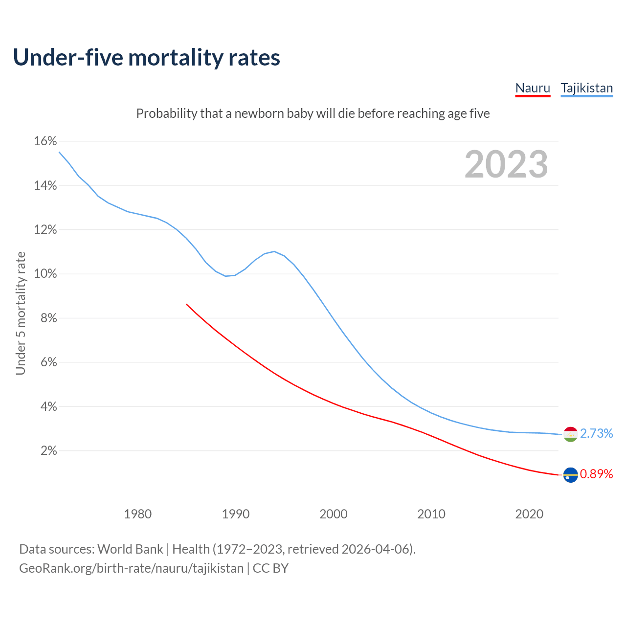 The chance that a newborn baby will die before reaching age five is 0.89% in Nauru and 2.73% in Tajikistan. Above is a chart with historical data on under-five mortality rates.