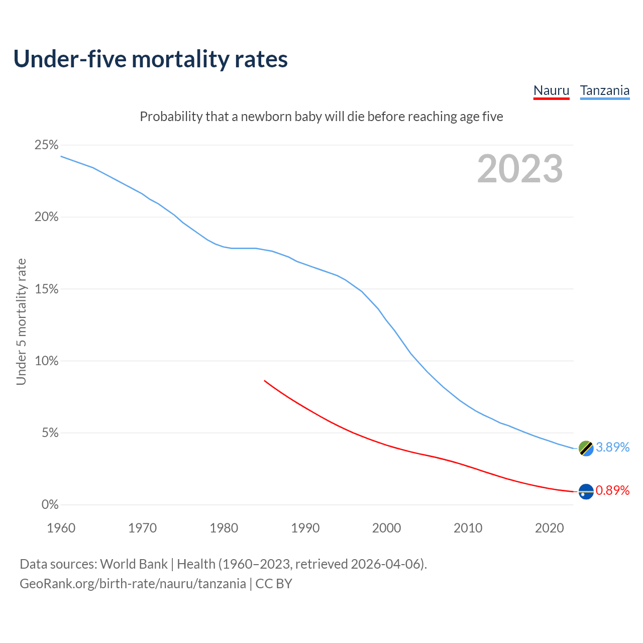 The chance that a newborn baby will die before reaching age five is 0.89% in Nauru and 3.89% in Tanzania. Above is a chart with historical data on under-five mortality rates.