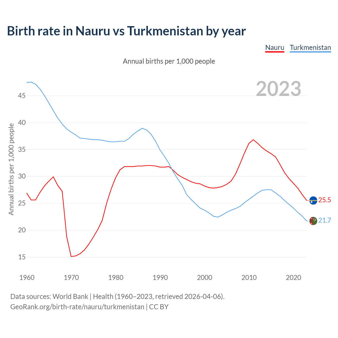 Nauru has an annual birth rate of 25.5 births per 1,000 people, compared to 21.7 for Turkmenistan. The average number of children a woman is expected to have during her lifetime — the fertility rate, is 3.33 in Nauru and 2.69 in Turkmenistan — 19.2% difference.