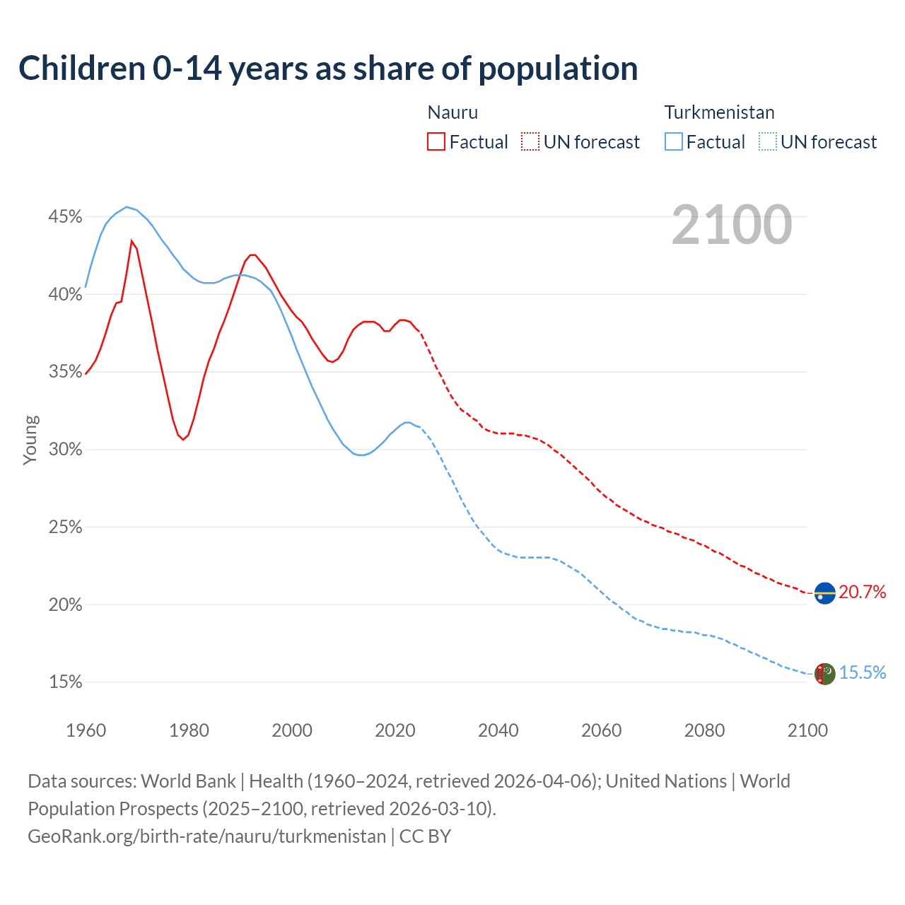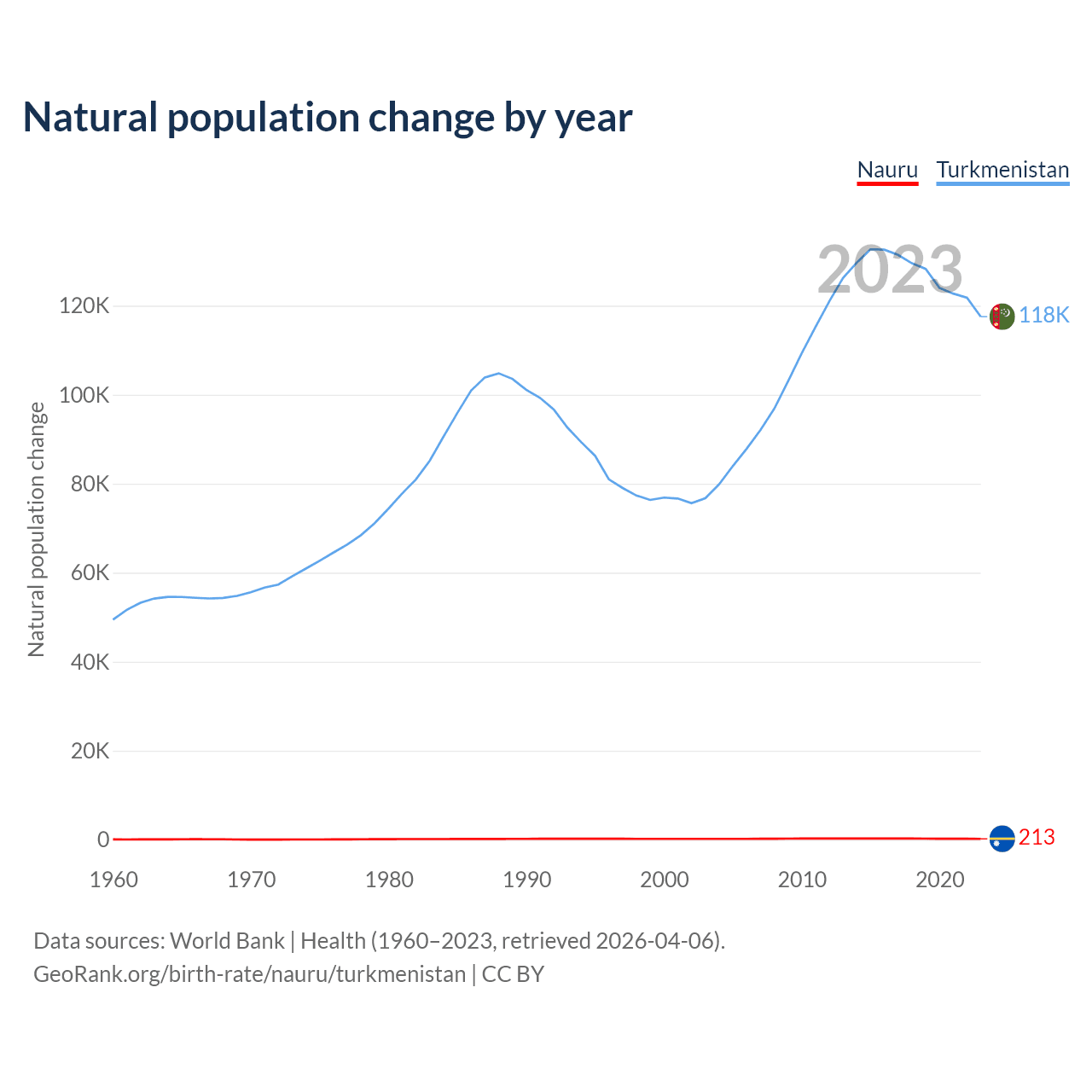 According to the latest available data on birth rates, the fertility rate in Nauru was 3.33 children per woman in 2023, compared to 2.69 in Turkmenistan in 2023. The replacement level is considered to be 2.1 children per woman.
