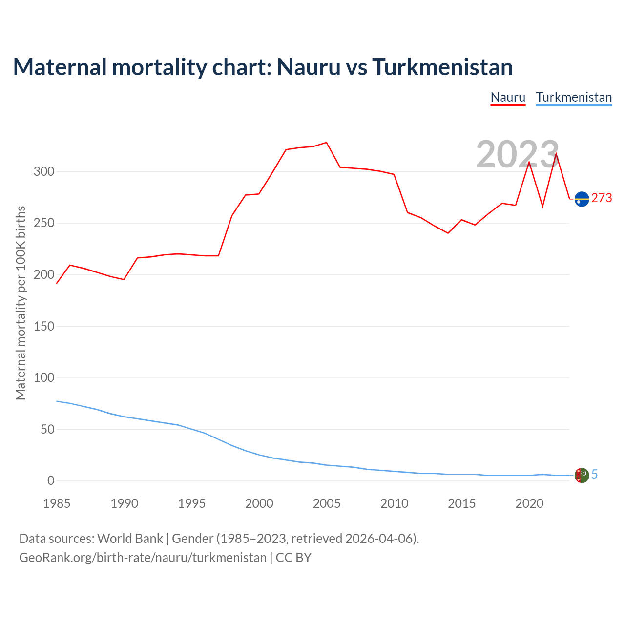 The maternal mortality rate, which is the probability of dying during childbirth or within 42 days of pregnancy termination, is 273 deaths per 100,000 live births in Nauru, compared to 5 deaths in Turkmenistan.