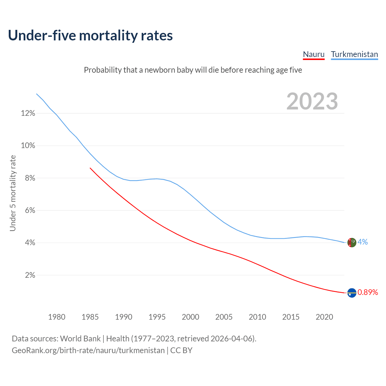 The chance that a newborn baby will die before reaching age five is 0.89% in Nauru and 4% in Turkmenistan. Above is a chart with historical data on under-five mortality rates.