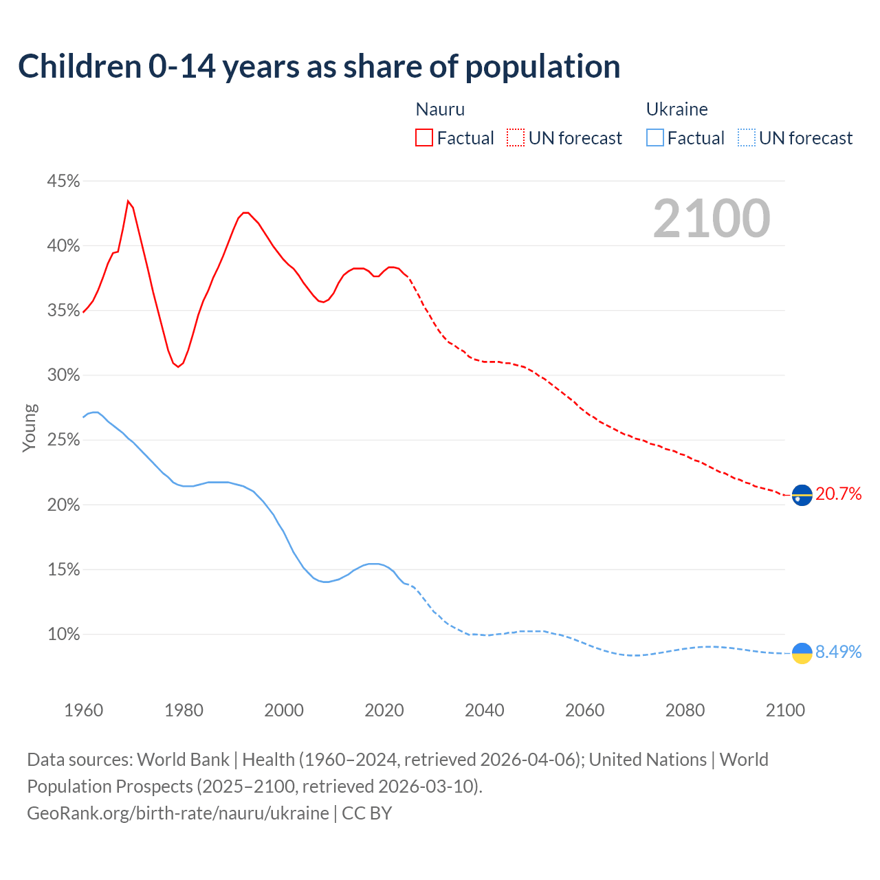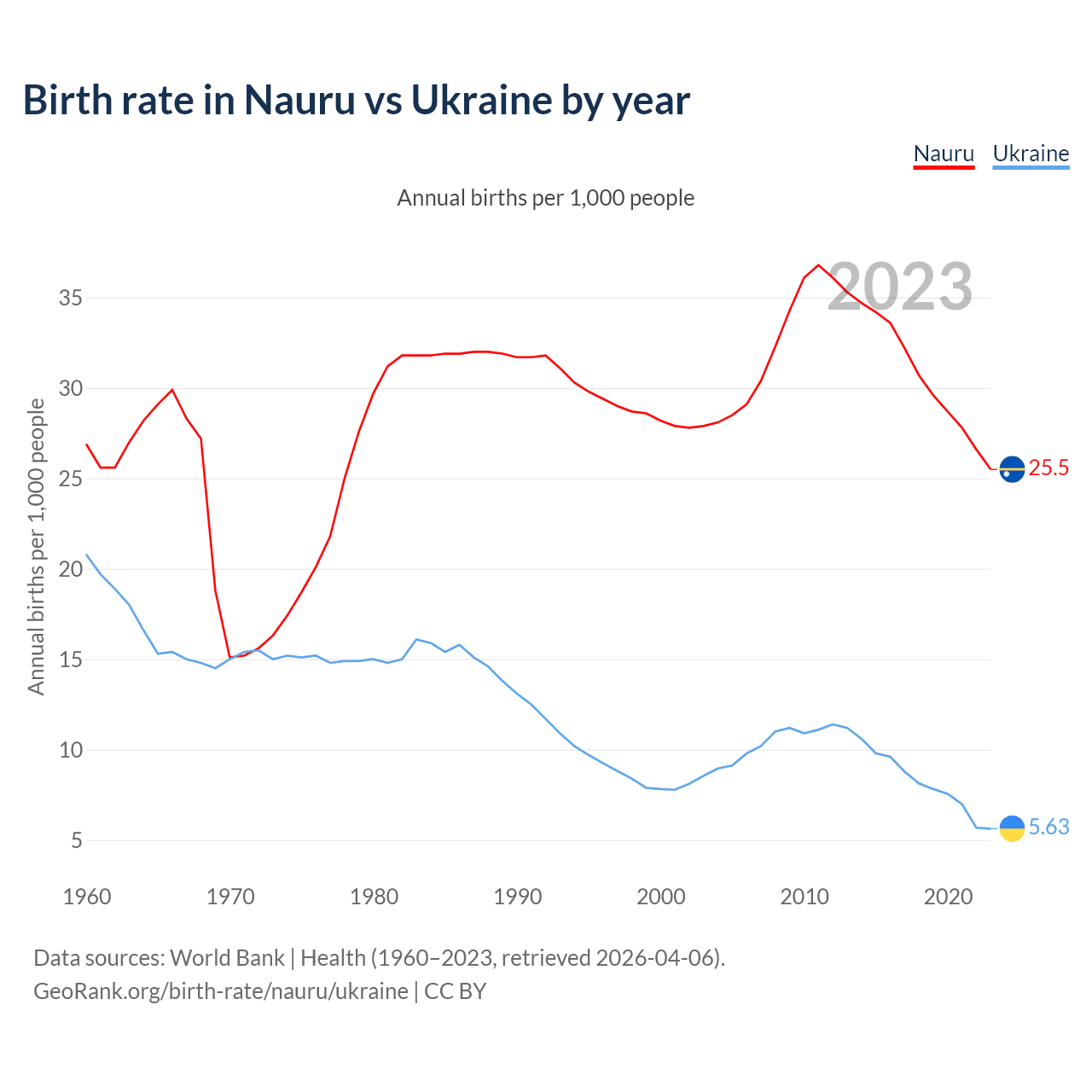 Nauru has an annual birth rate of 25.5 births per 1,000 people, compared to 5.63 for Ukraine. The average number of children a woman is expected to have during her lifetime — the fertility rate, is 3.33 in Nauru and 0.98 in Ukraine — 70.7% difference.
