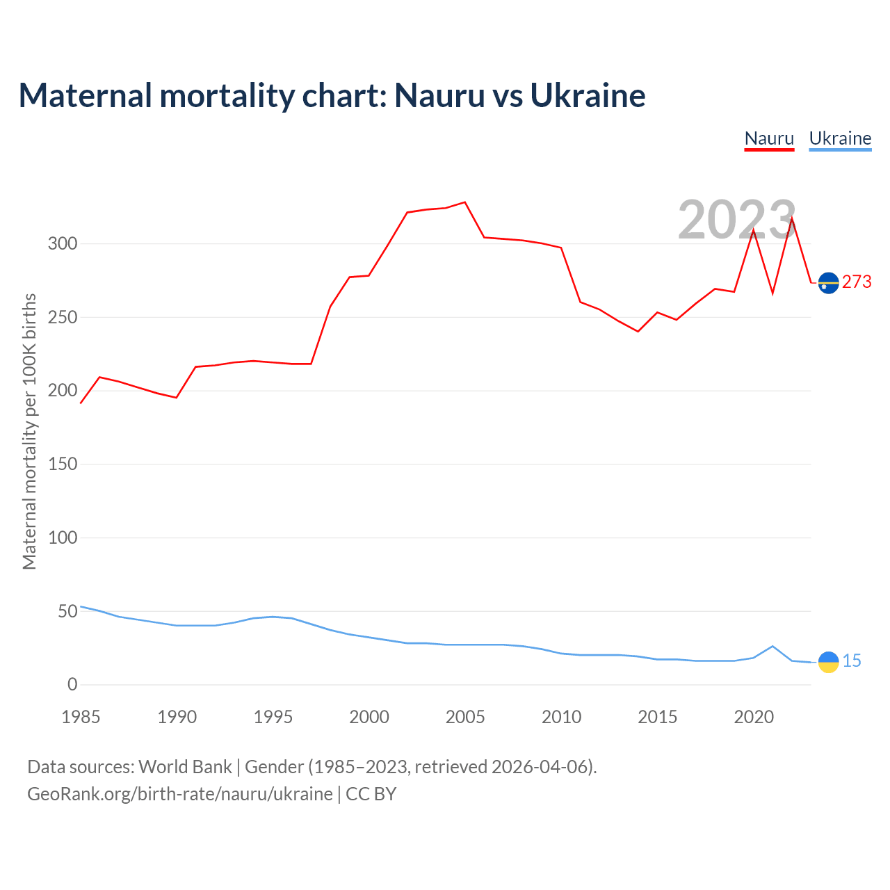 The maternal mortality rate, which is the probability of dying during childbirth or within 42 days of pregnancy termination, is 273 deaths per 100,000 live births in Nauru, compared to 15 deaths in Ukraine.