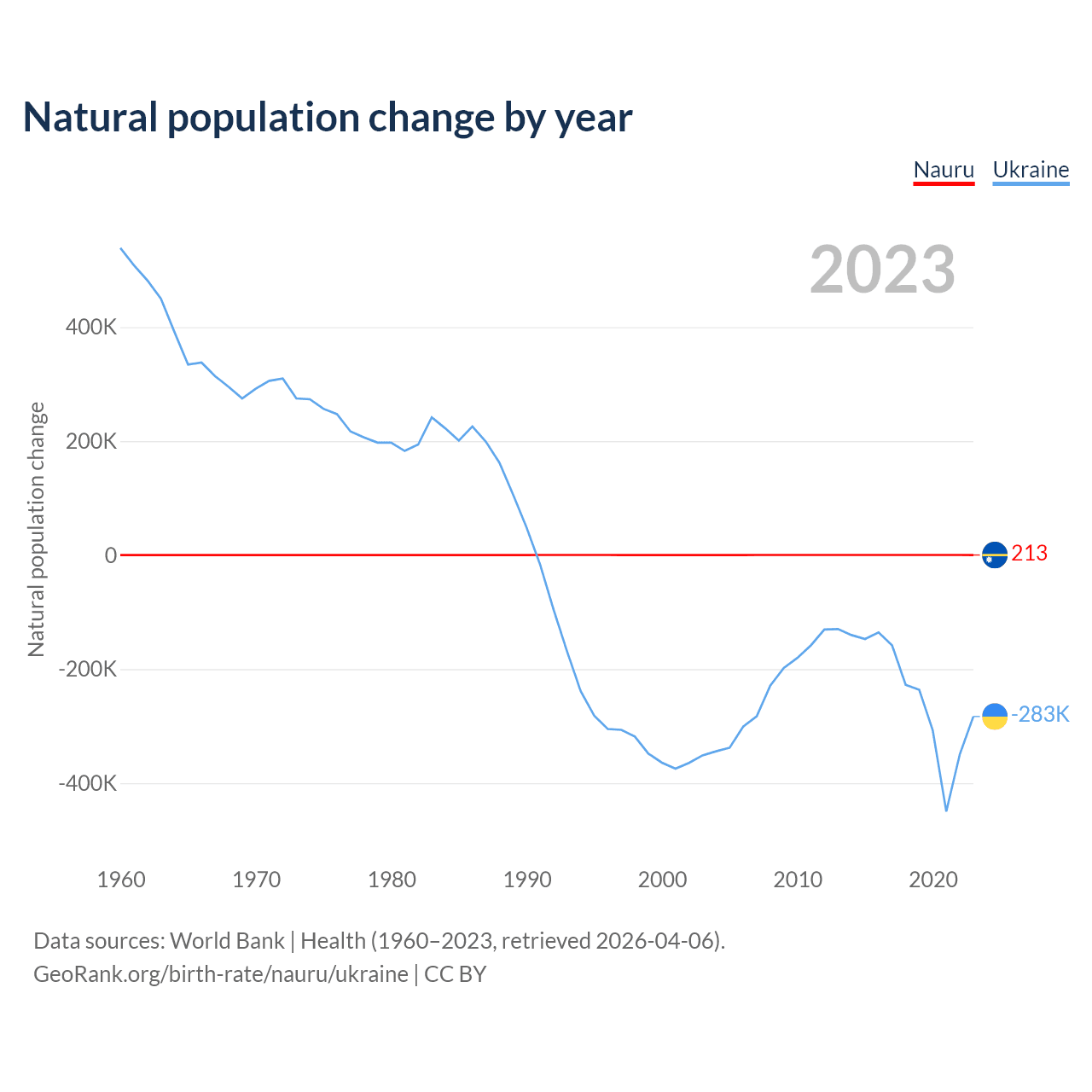 According to the latest available data on birth rates, the fertility rate in Nauru was 3.33 children per woman in 2023, compared to 0.98 in Ukraine in 2023. The replacement level is considered to be 2.1 children per woman.