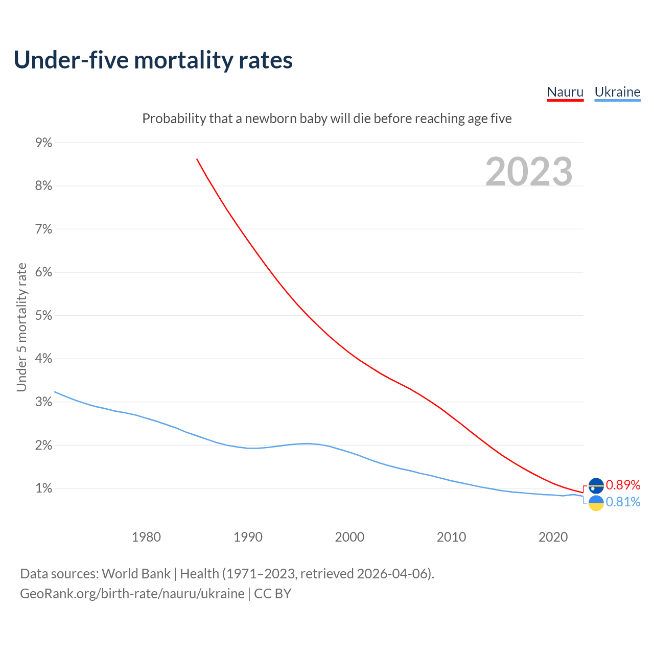 The chance that a newborn baby will die before reaching age five is 0.89% in Nauru and 0.81% in Ukraine. Above is a chart with historical data on under-five mortality rates.