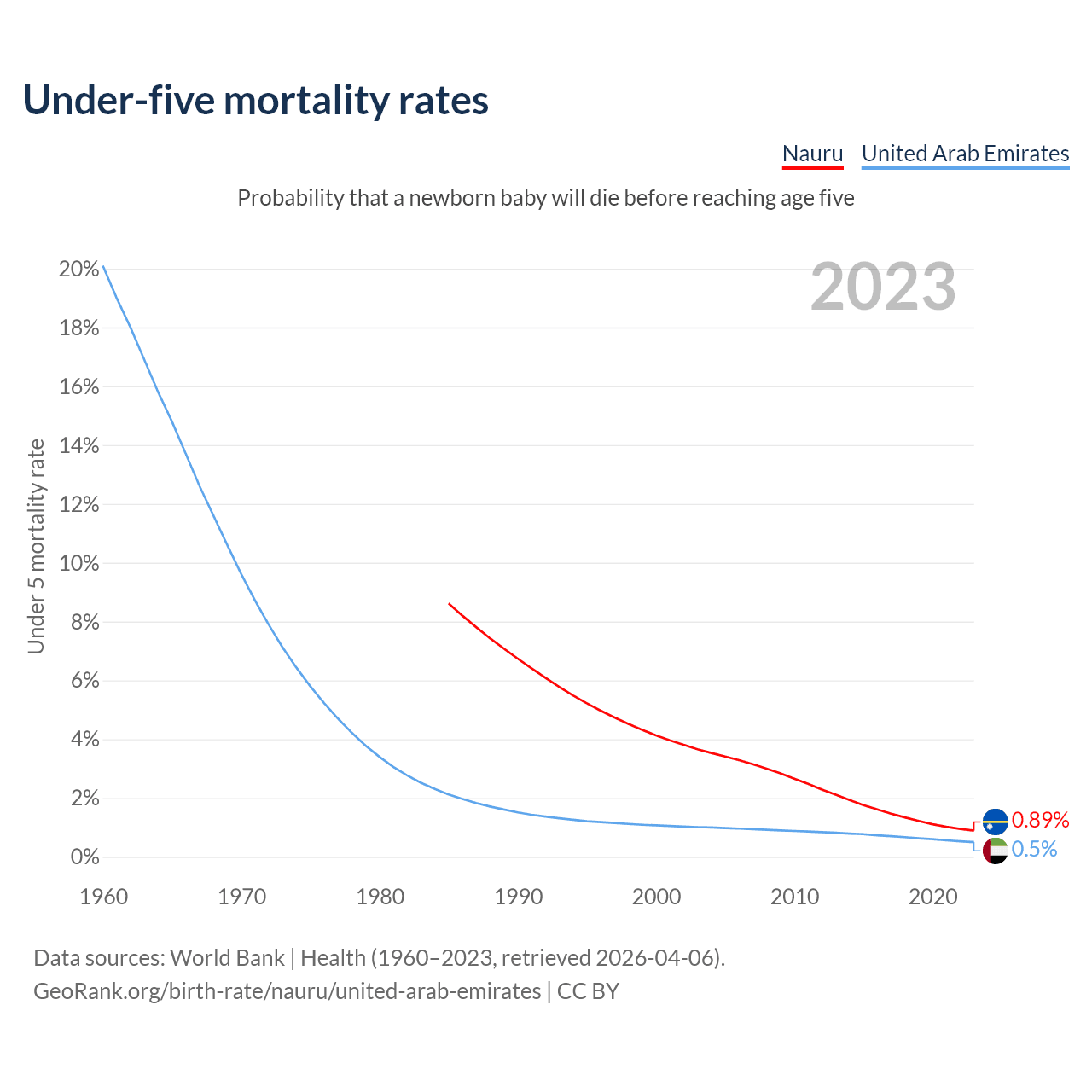 The chance that a newborn baby will die before reaching age five is 0.89% in Nauru and 0.5% in the United Arab Emirates. Above is a chart with historical data on under-five mortality rates.
