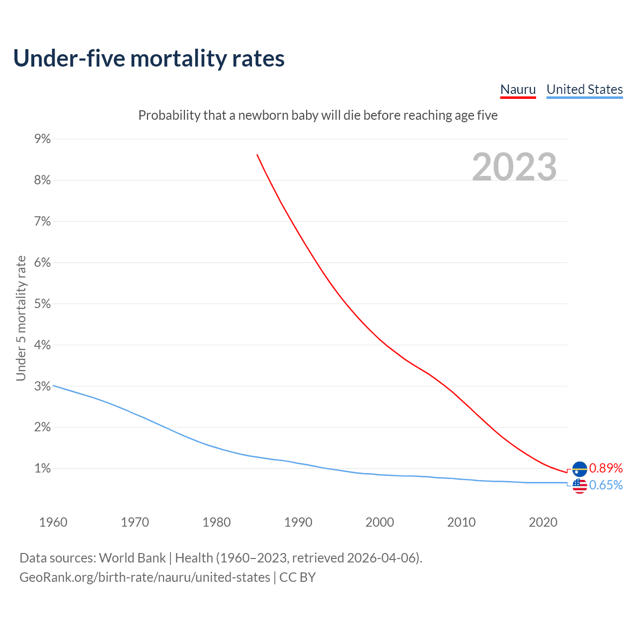 The chance that a newborn baby will die before reaching age five is 0.89% in Nauru and 0.65% in the United States. Above is a chart with historical data on under-five mortality rates.