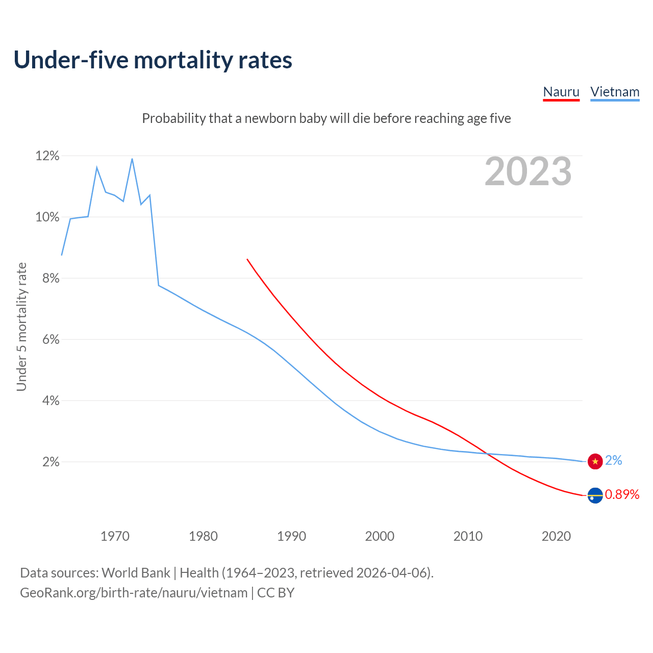 The chance that a newborn baby will die before reaching age five is 0.89% in Nauru and 2% in Vietnam. Above is a chart with historical data on under-five mortality rates.