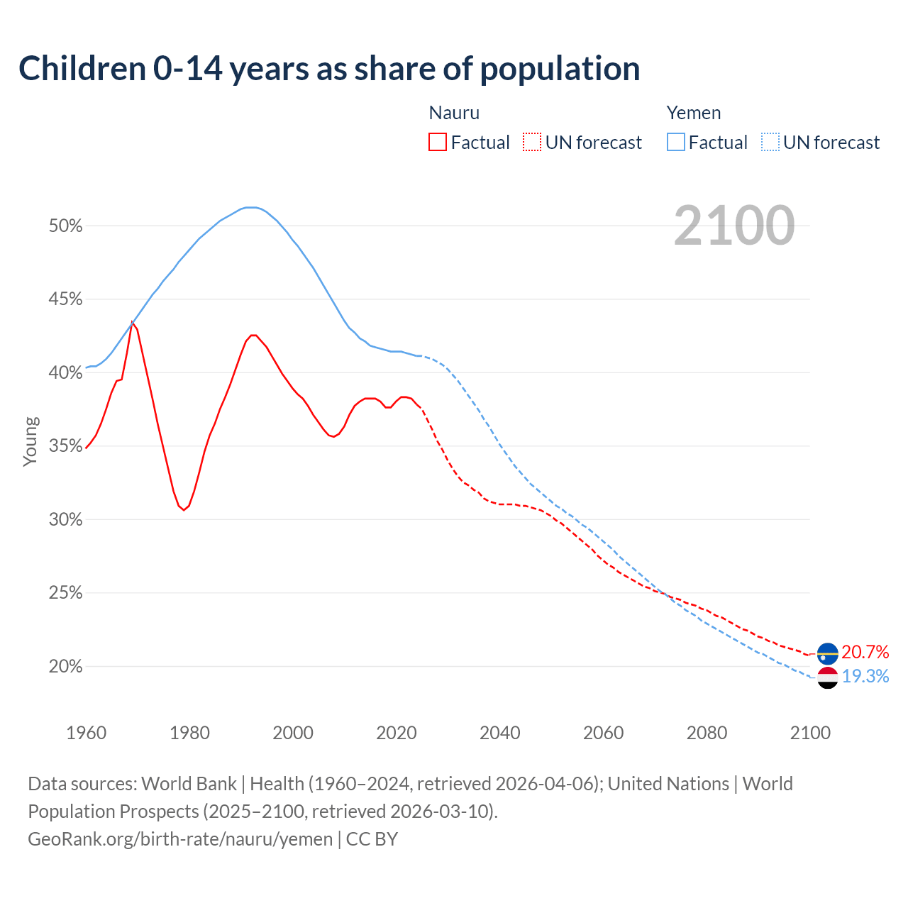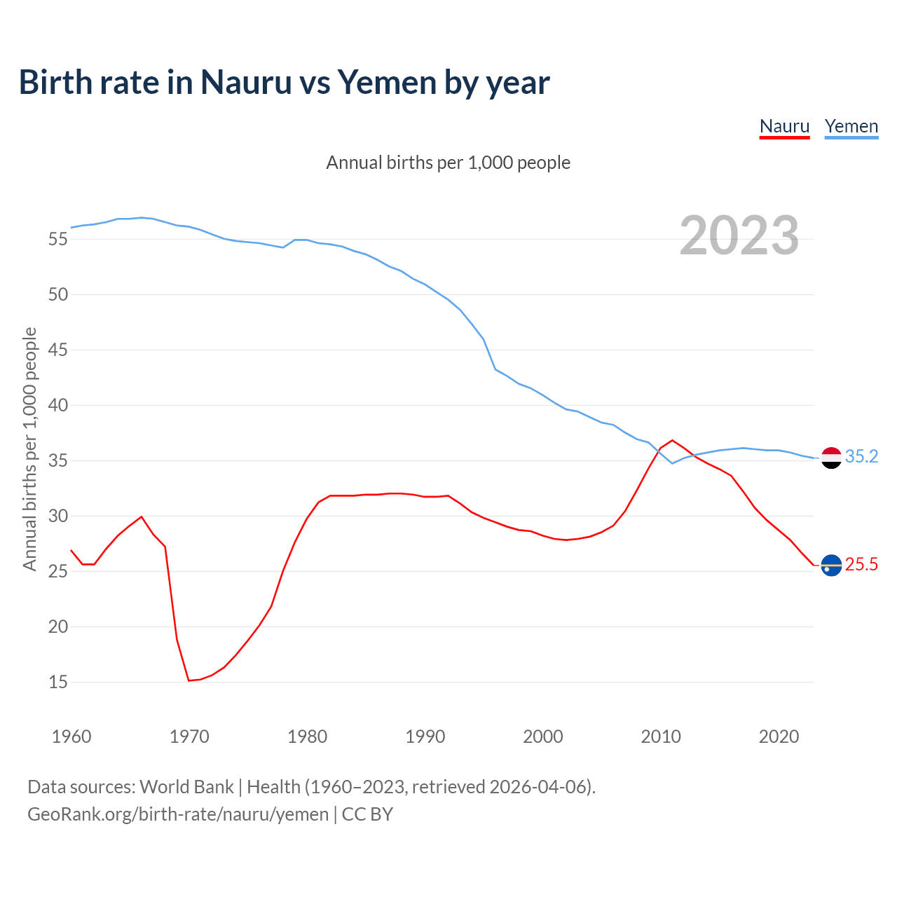Nauru has an annual birth rate of 25.5 births per 1,000 people, compared to 35.2 for Yemen. The average number of children a woman is expected to have during her lifetime — the fertility rate, is 3.33 in Nauru and 4.59 in Yemen — 37.8% difference.