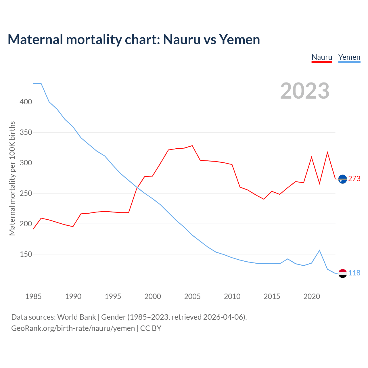 The maternal mortality rate, which is the probability of dying during childbirth or within 42 days of pregnancy termination, is 273 deaths per 100,000 live births in Nauru, compared to 118 deaths in Yemen.