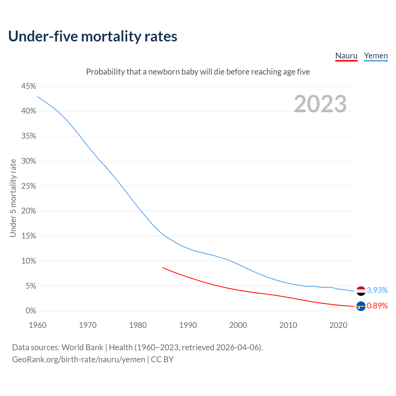 The chance that a newborn baby will die before reaching age five is 0.89% in Nauru and 3.93% in Yemen. Above is a chart with historical data on under-five mortality rates.