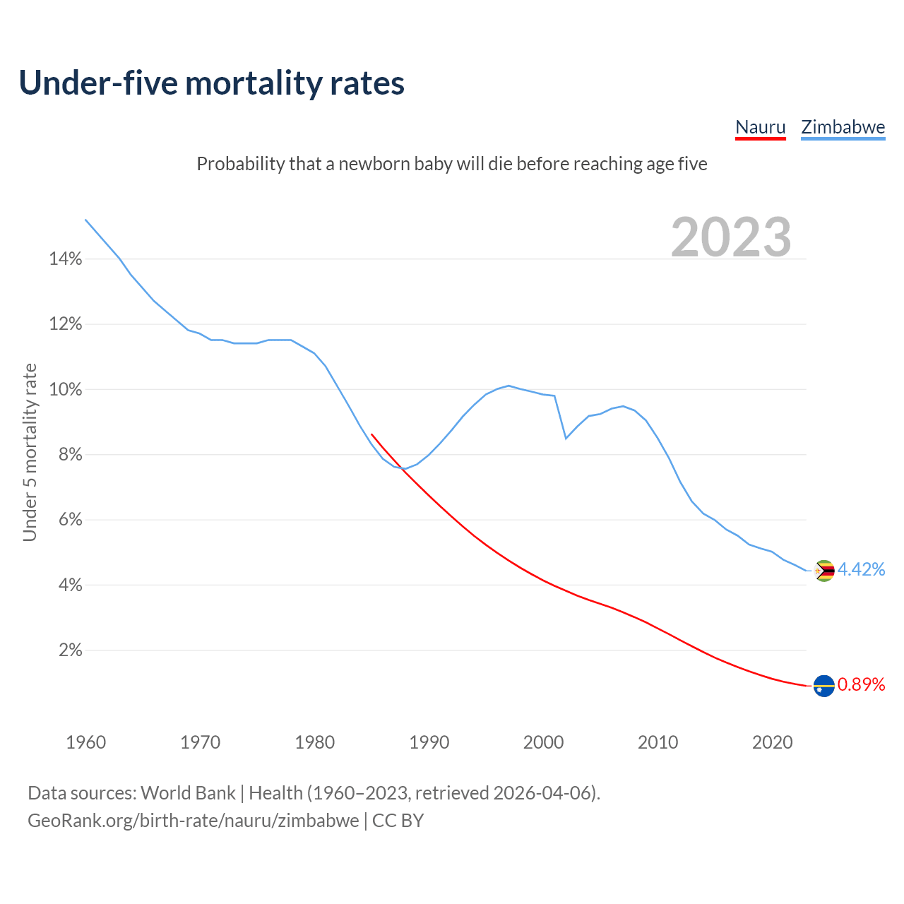 The chance that a newborn baby will die before reaching age five is 0.89% in Nauru and 4.42% in Zimbabwe. Above is a chart with historical data on under-five mortality rates.