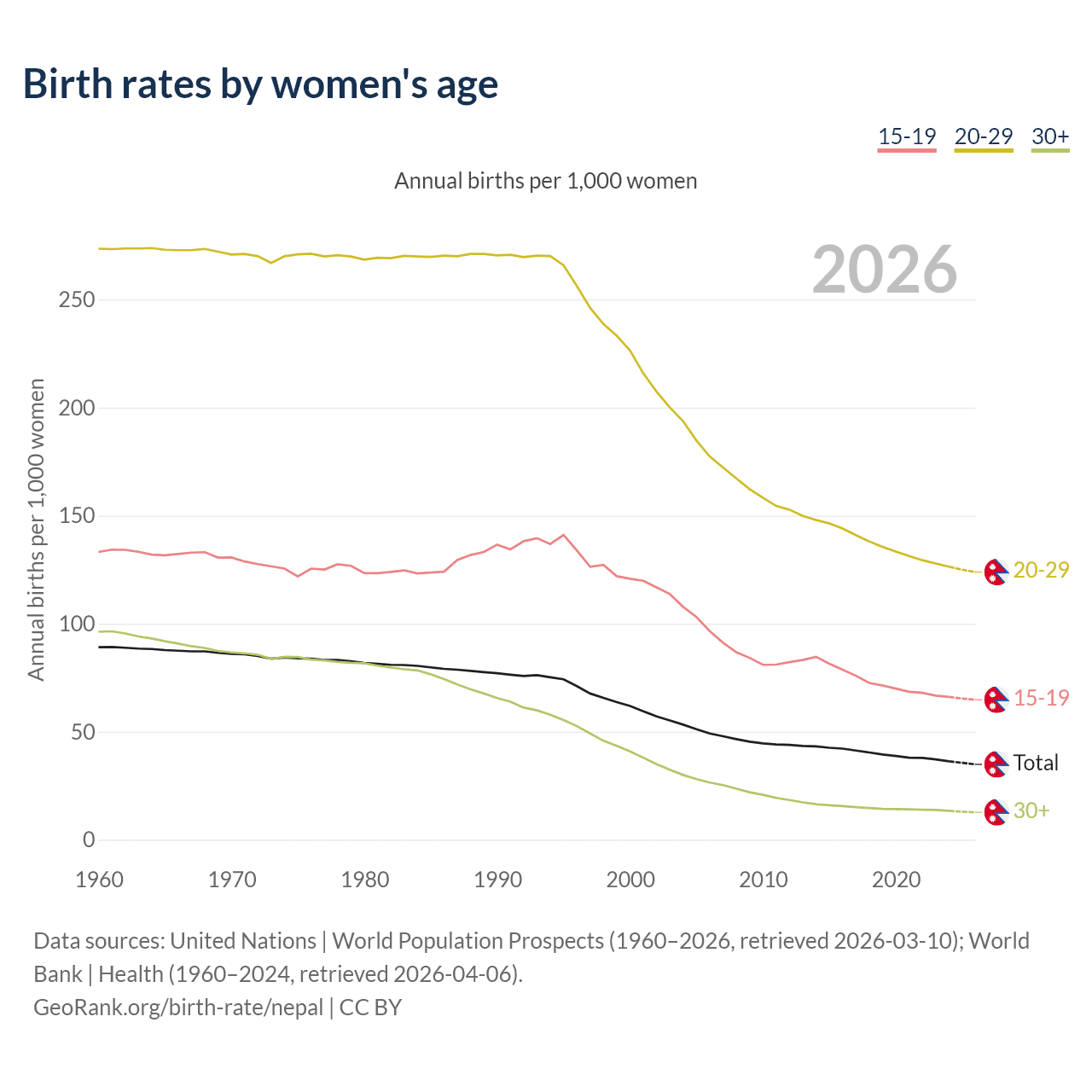 According to the latest birth rate data available, the fertility rate in Nepal was 1.98 in 2023 and has been below the replacement level of 2.1 children per woman since 2019. In 1993, the fertility rate was 5.04 — a 60.7% decline in 30 years.