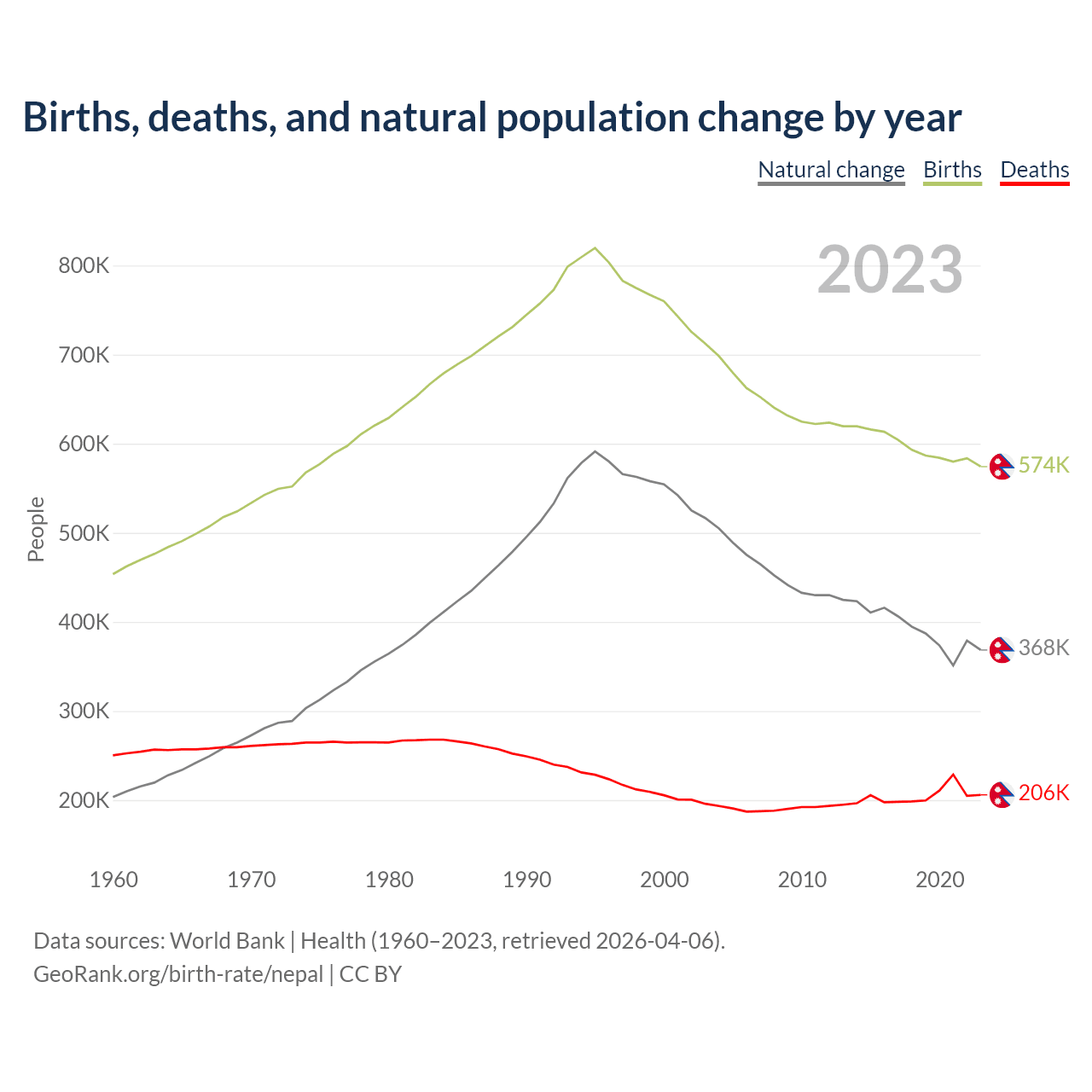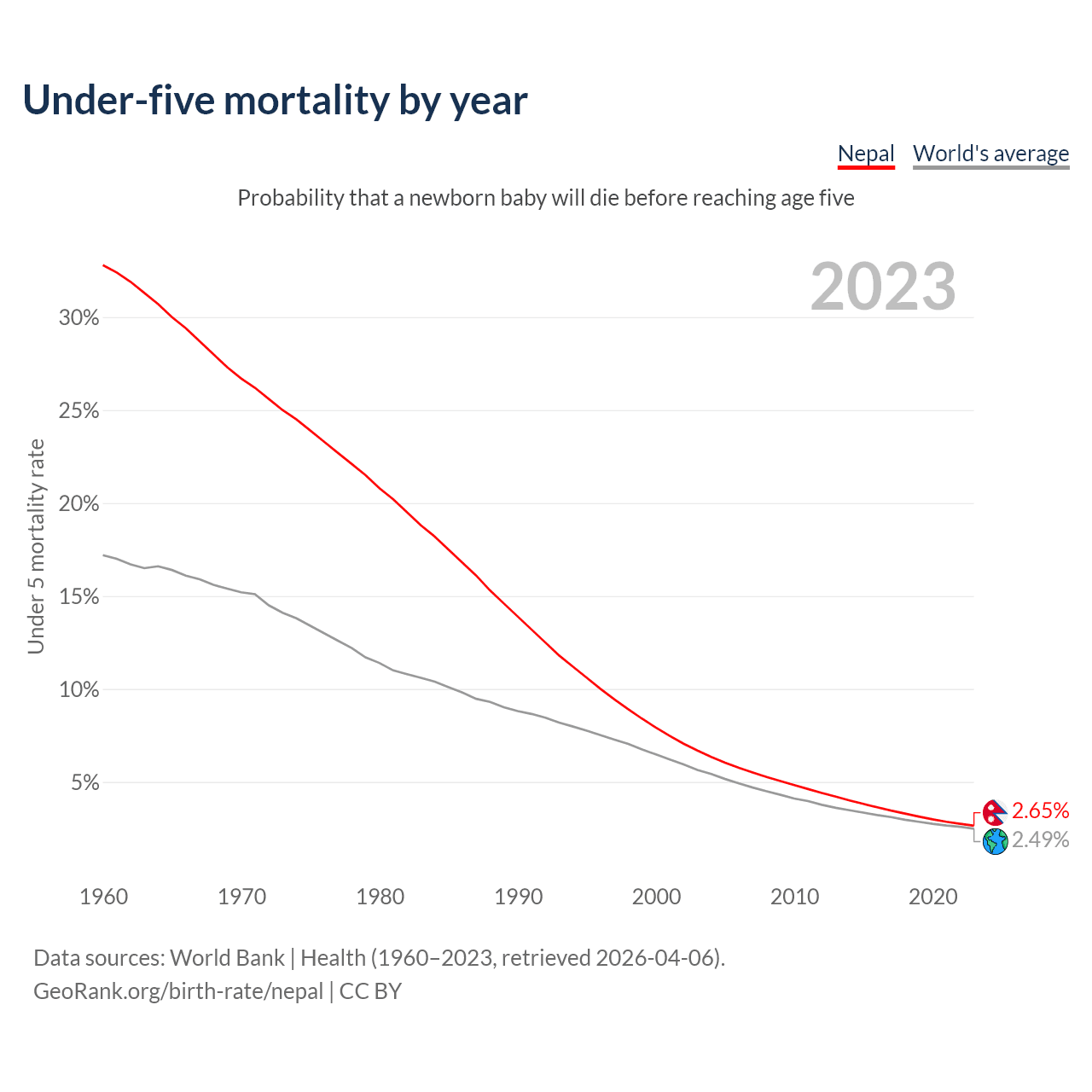 The under-5 mortality rate in Nepal was 26.5 deaths per 1,000 live births in 2023 — a 2.65% chance that a newborn baby will die before reaching age five. This is down from 79.2 deaths per 1,000 live births in 2000.