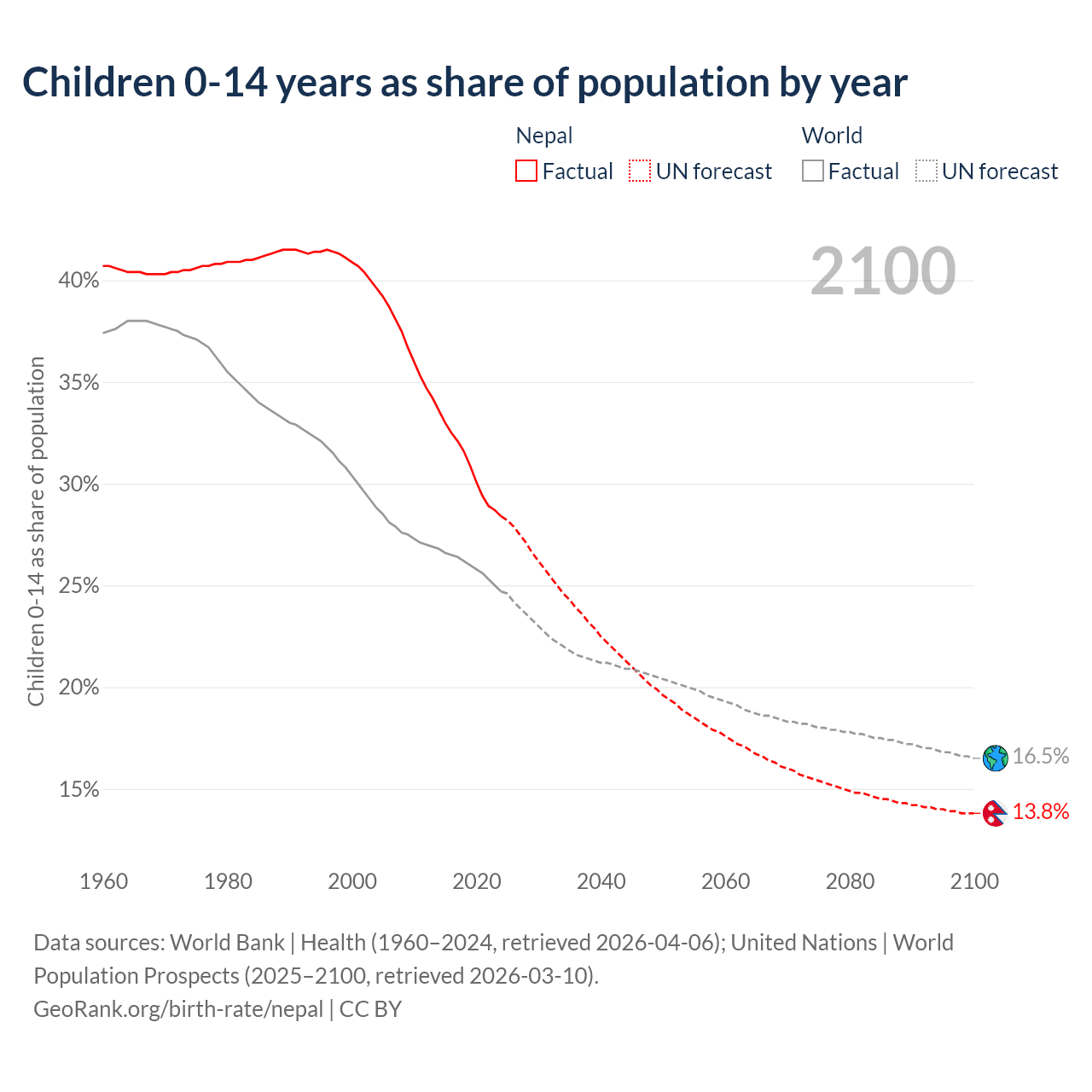 Nepal has a birth rate of 19.3 (annual births per 1,000 people) and a fertility rate of 1.98 (the average number of children a woman is expected to have over her lifetime based on current age-specific birth rates).
