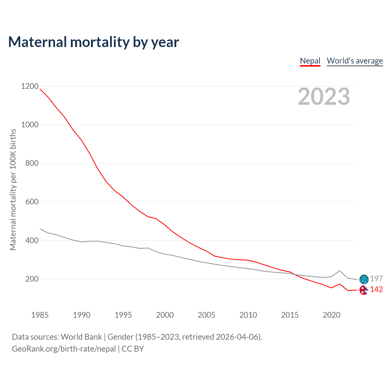 The maternal mortality rate in Nepal was 142 deaths per 100,000 live births in 2023 — a 0.14% chance of dying during childbirth or within 42 days of pregnancy termination. This is a 70.4% decrease compared to the year 2000.