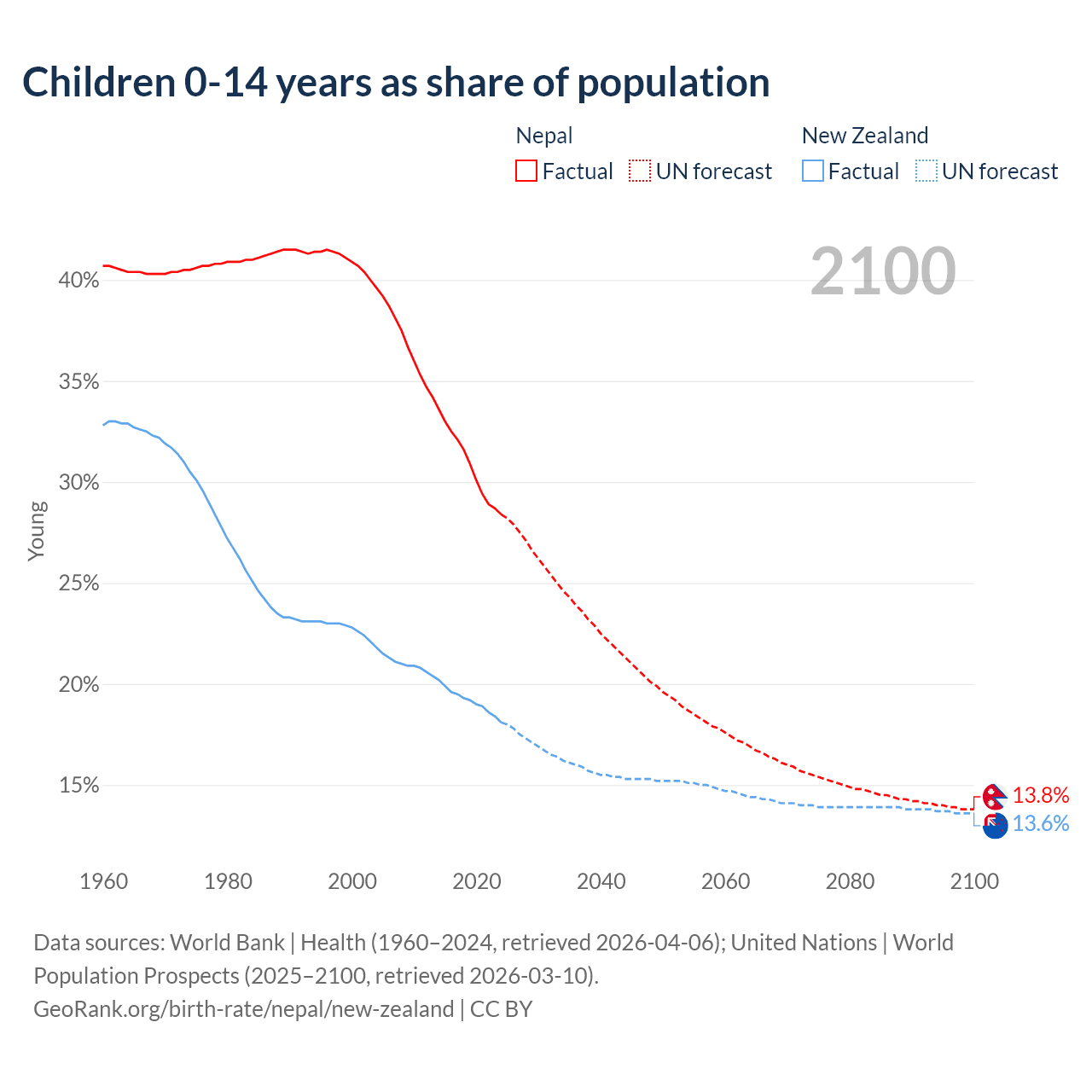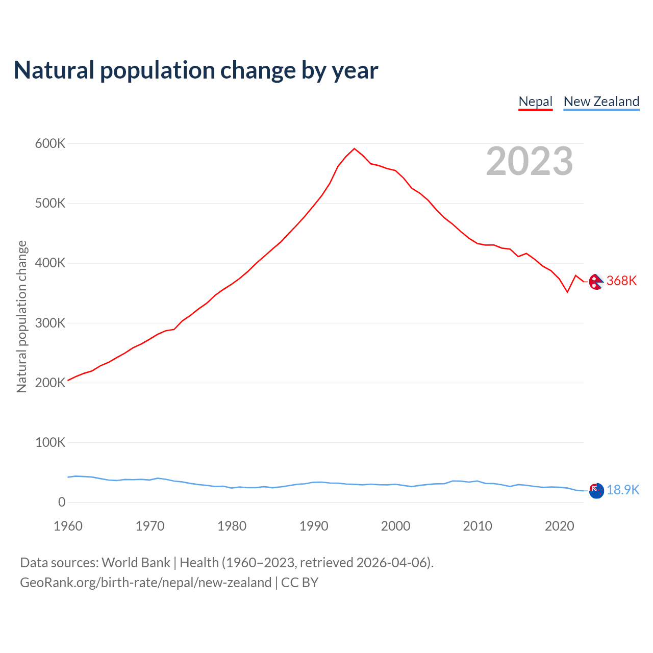 According to the latest available data on birth rates, the fertility rate in Nepal was 1.98 children per woman in 2023, compared to 1.56 in New Zealand in 2023. The replacement level is considered to be 2.1 children per woman.