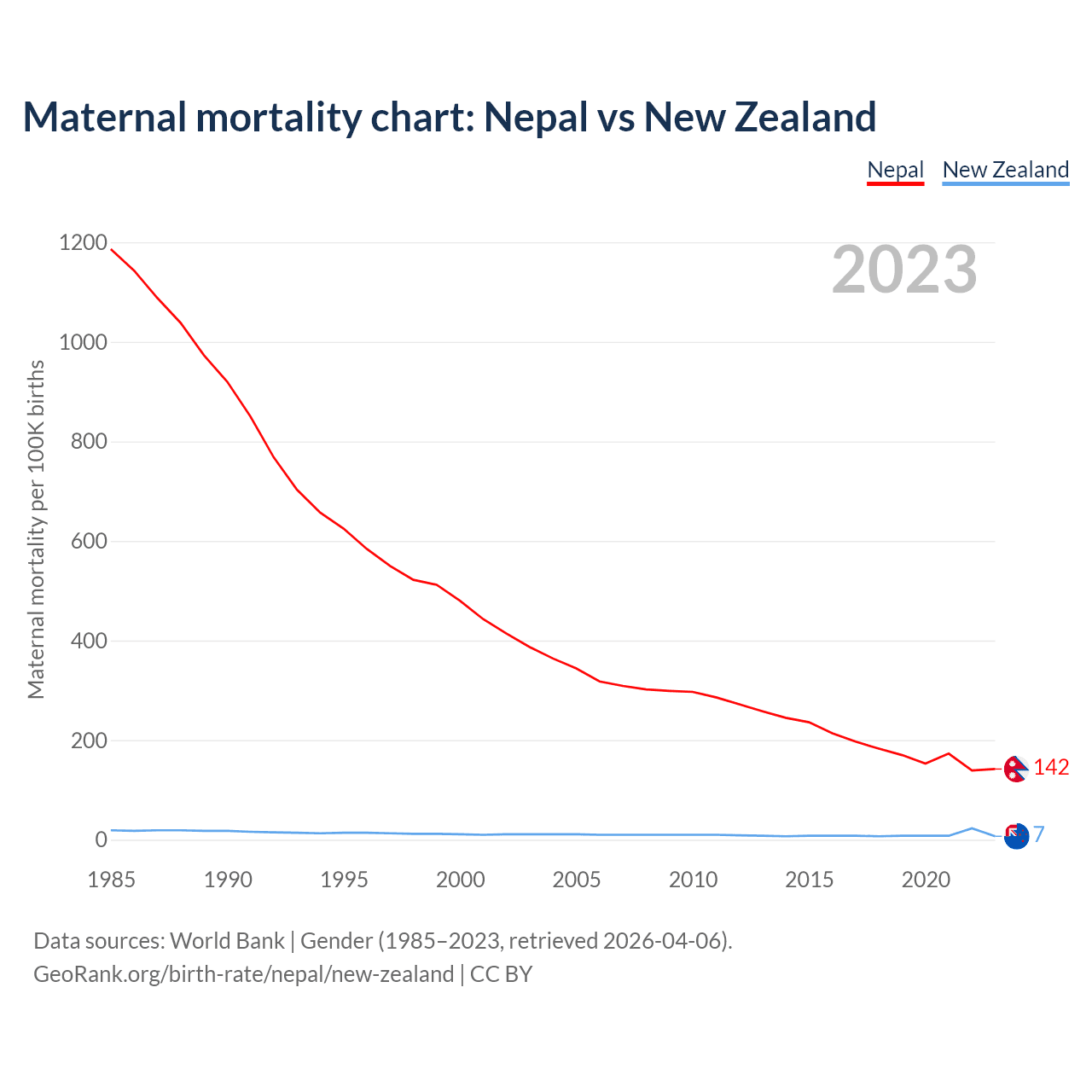 The maternal mortality rate, which is the probability of dying during childbirth or within 42 days of pregnancy termination, is 142 deaths per 100,000 live births in Nepal, compared to 7 deaths in New Zealand.