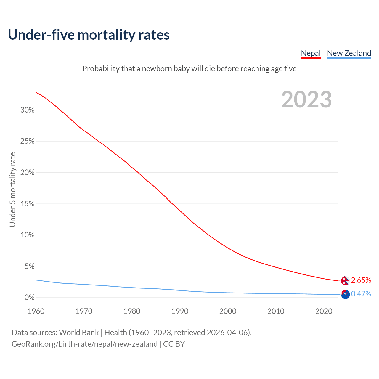 The chance that a newborn baby will die before reaching age five is 2.65% in Nepal and 0.47% in New Zealand. Above is a chart with historical data on under-five mortality rates.