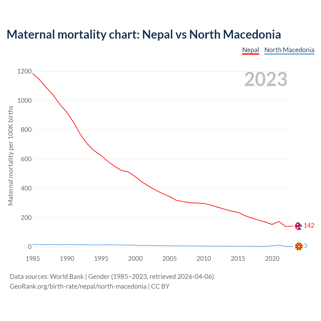 The maternal mortality rate, which is the probability of dying during childbirth or within 42 days of pregnancy termination, is 142 deaths per 100,000 live births in Nepal, compared to 3 deaths in North Macedonia.