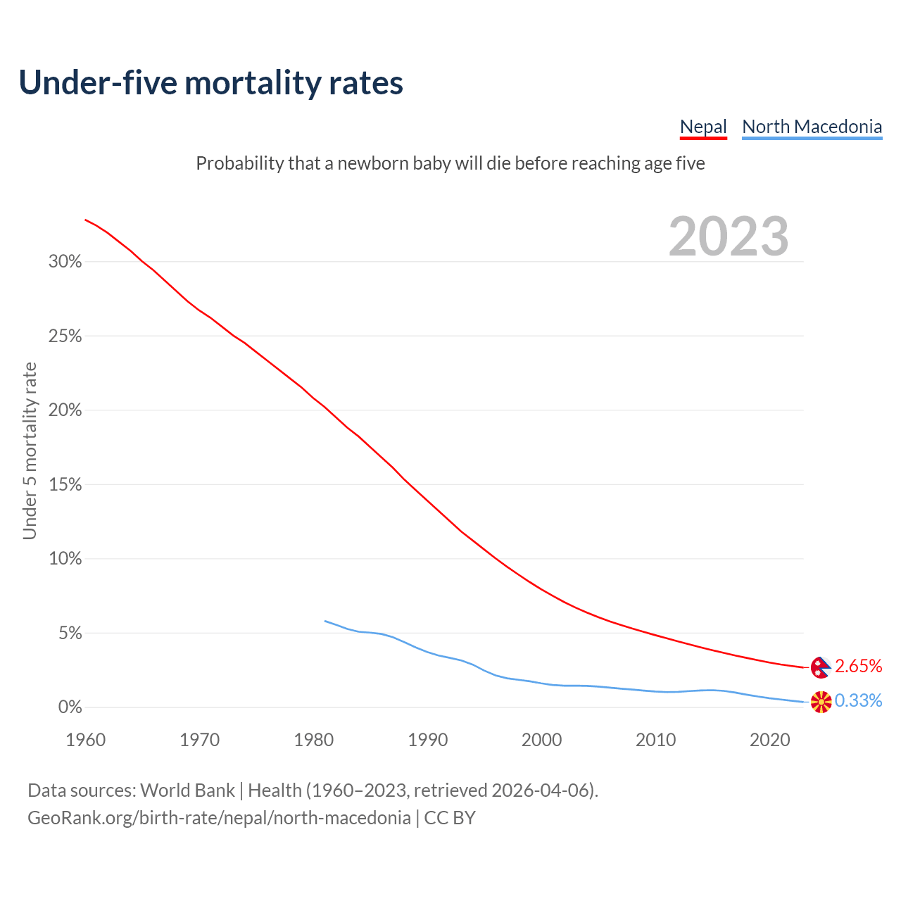 The chance that a newborn baby will die before reaching age five is 2.65% in Nepal and 0.33% in North Macedonia. Above is a chart with historical data on under-five mortality rates.