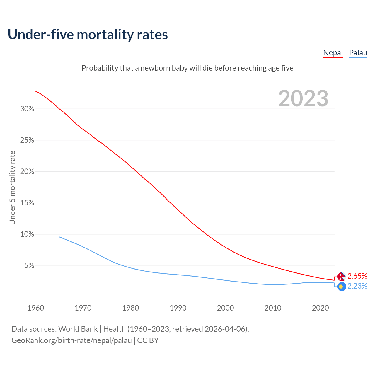 The chance that a newborn baby will die before reaching age five is 2.65% in Nepal and 2.23% in Palau. Above is a chart with historical data on under-five mortality rates.