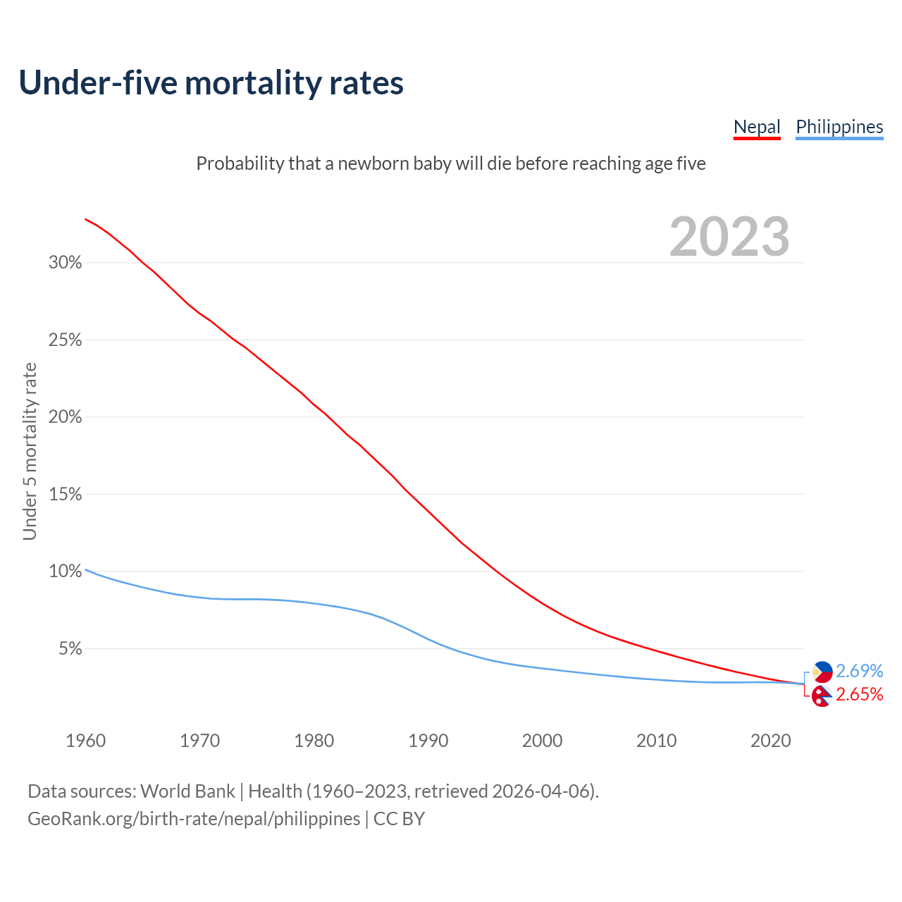 The chance that a newborn baby will die before reaching age five is 2.65% in Nepal and 2.69% in the Philippines. Above is a chart with historical data on under-five mortality rates.