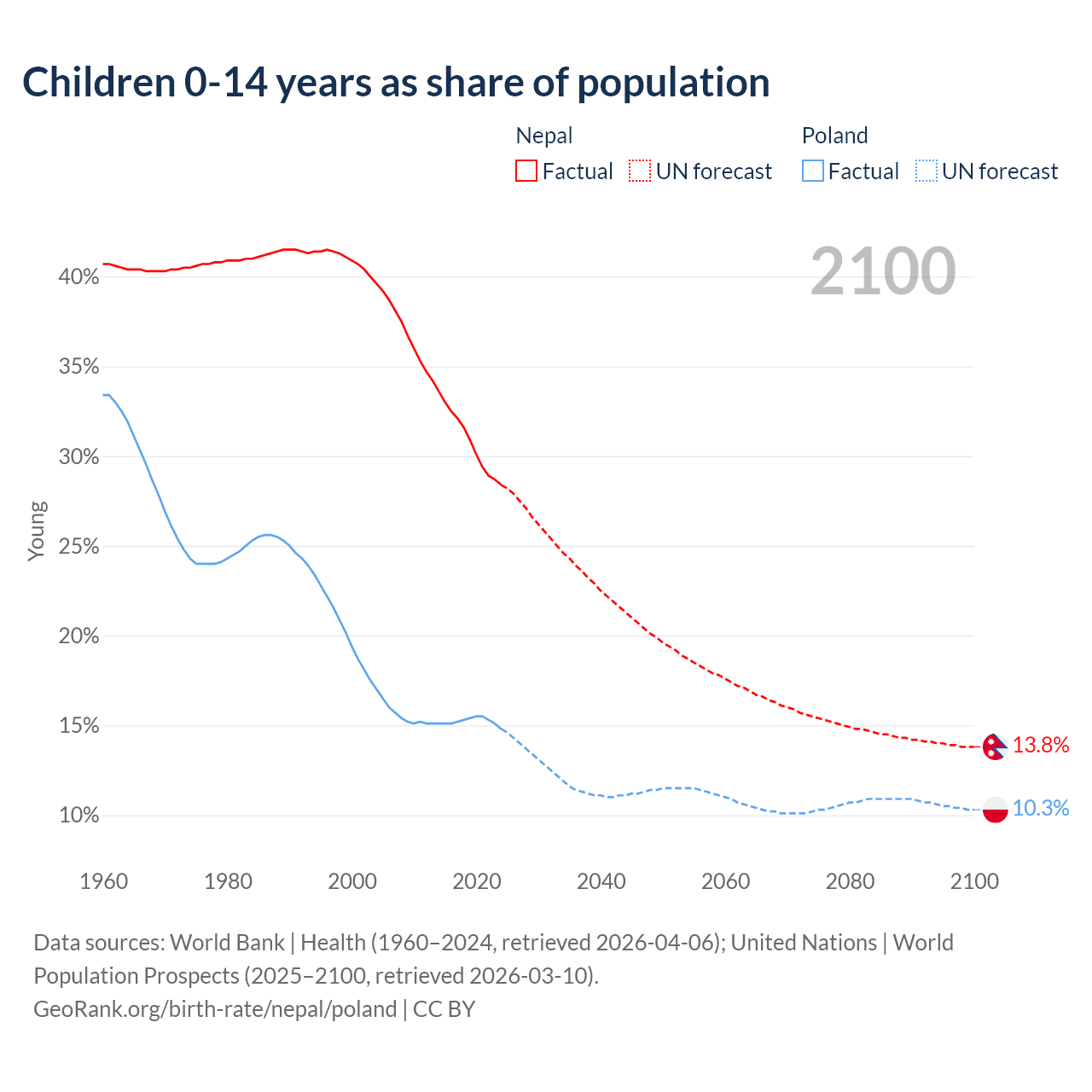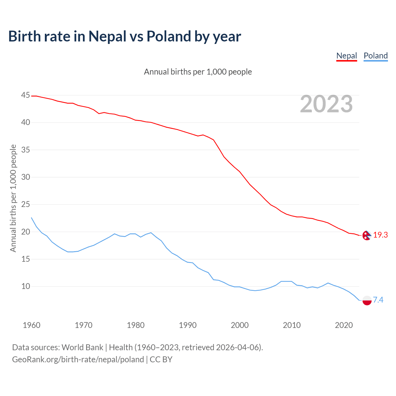 Nepal has an annual birth rate of 19.3 births per 1,000 people, compared to 7.4 for Poland. The average number of children a woman is expected to have during her lifetime — the fertility rate, is 1.98 in Nepal and 1.16 in Poland — 41.6% difference.