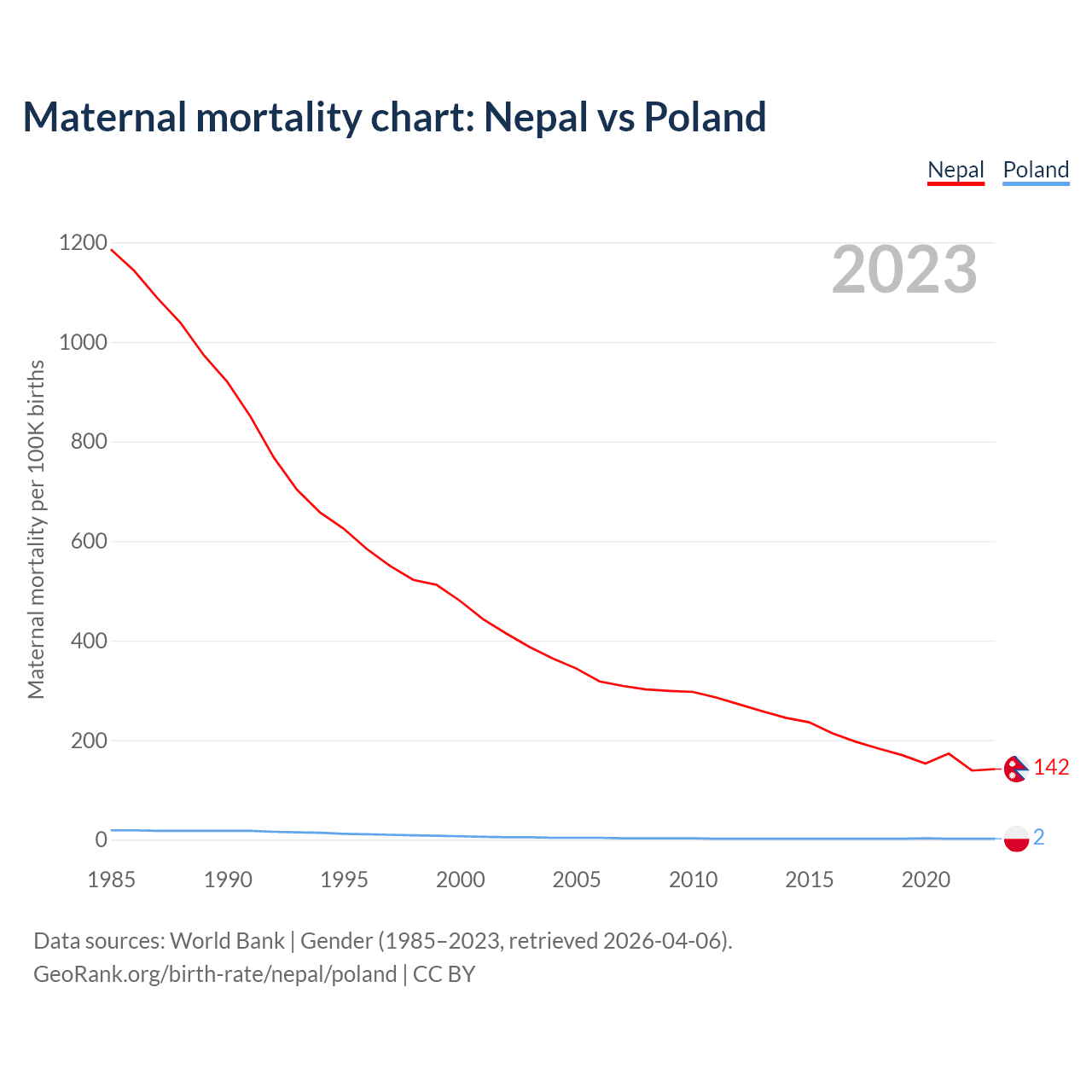 The maternal mortality rate, which is the probability of dying during childbirth or within 42 days of pregnancy termination, is 142 deaths per 100,000 live births in Nepal, compared to 2 deaths in Poland.